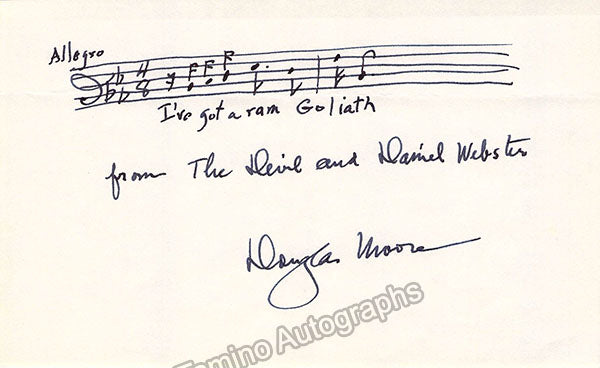 Nice 2-bar autograph music quote from his work The Devil and Daniel Webster signed by him. Size is 6 x 3.7 inches, in excellent condition.