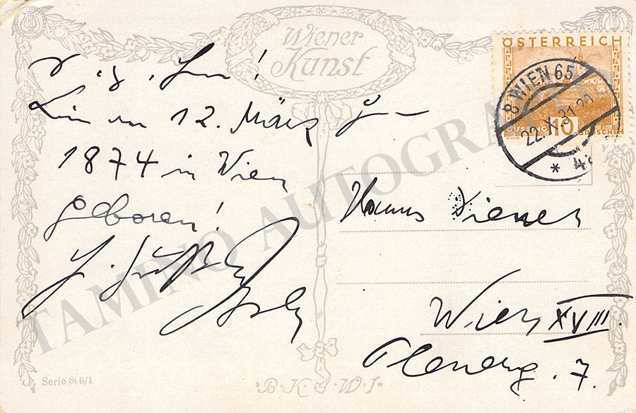 Autograph note in German on a postcard with his portrait by Anna Walt, signed by him to Herrn Viener clarifying that he was born on March 12, 1874 in Vienna. Size is 3.5 x 5.5 inches, evident crease over the lower-right corner, in excellent condition.