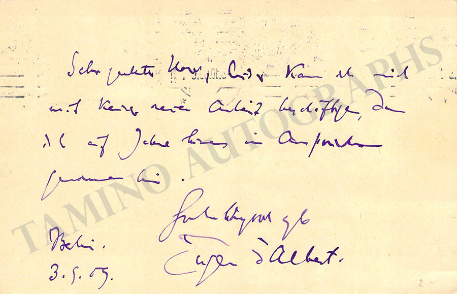 Autograph note in German on a postcard signed by him, dated in  Berlin, 1909, to Wilhelm Barlösius in Berlin, writing that he unfortunately won’t be able to meet him. Size is 5.4 x 3.5 inches, some dirt, in overall very good condition.