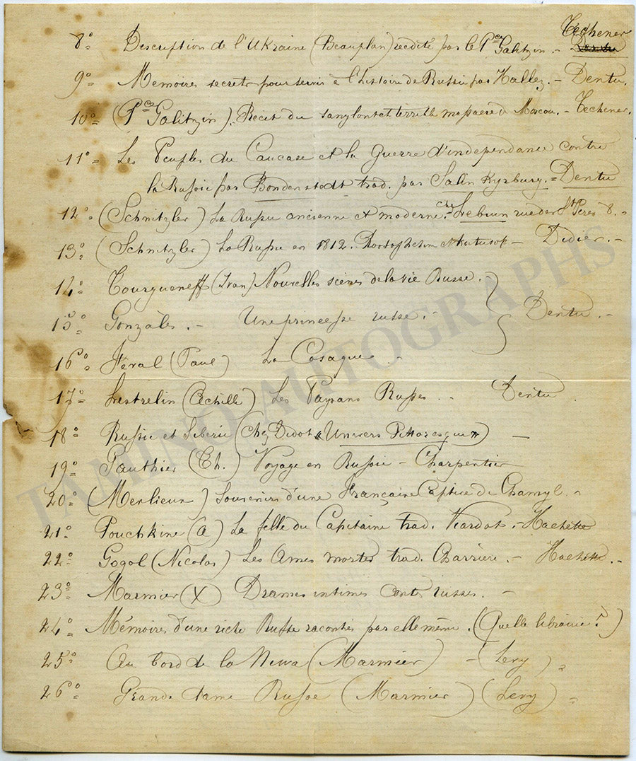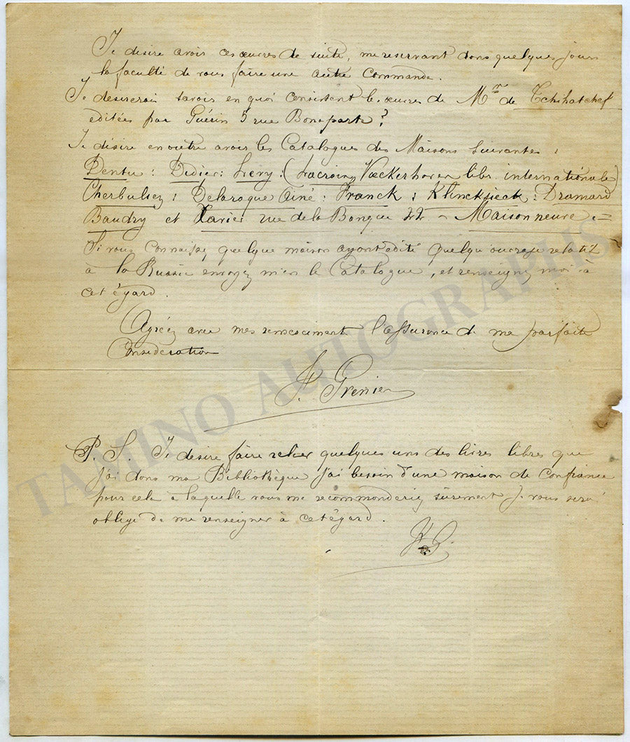 Autograph letter in French (untranslated) signed by him, dated June 23, 1870. Size is 7 x 8.5 inches, 3 written pages, evident stains, in overall good condition.