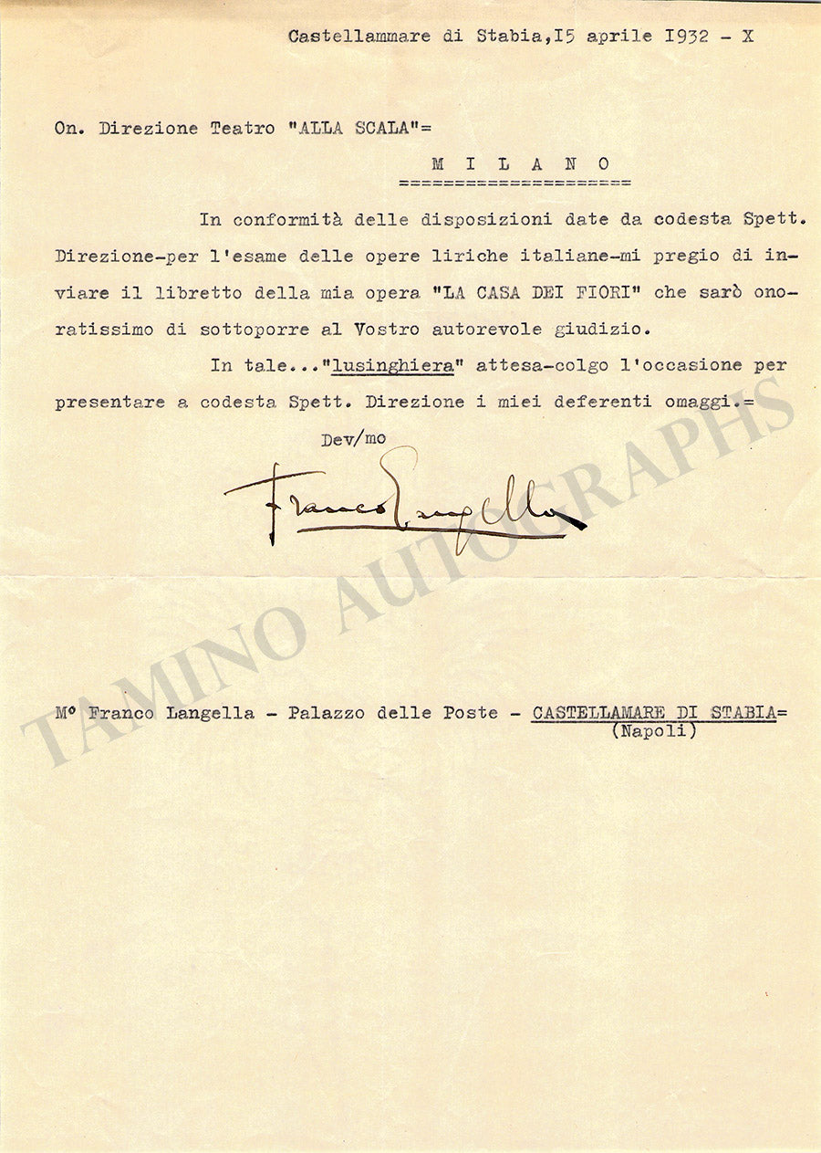 Short typed letter in Italian (untranslated) signed by him and dated 1932, forwarding to Teatro alla Scala the libret of his opera La Casa dei Fiori. Size is 7.5 x 10.6 inches approx., 1 typed page, central fold, in overall very good condition.