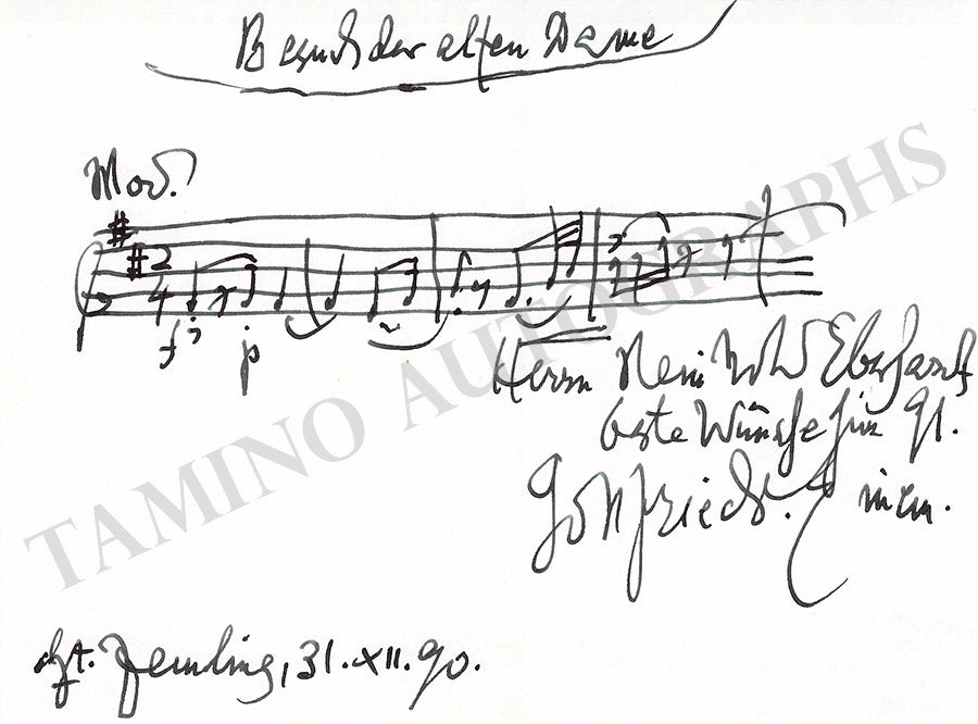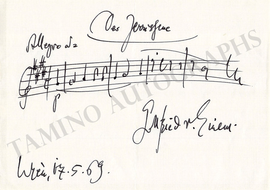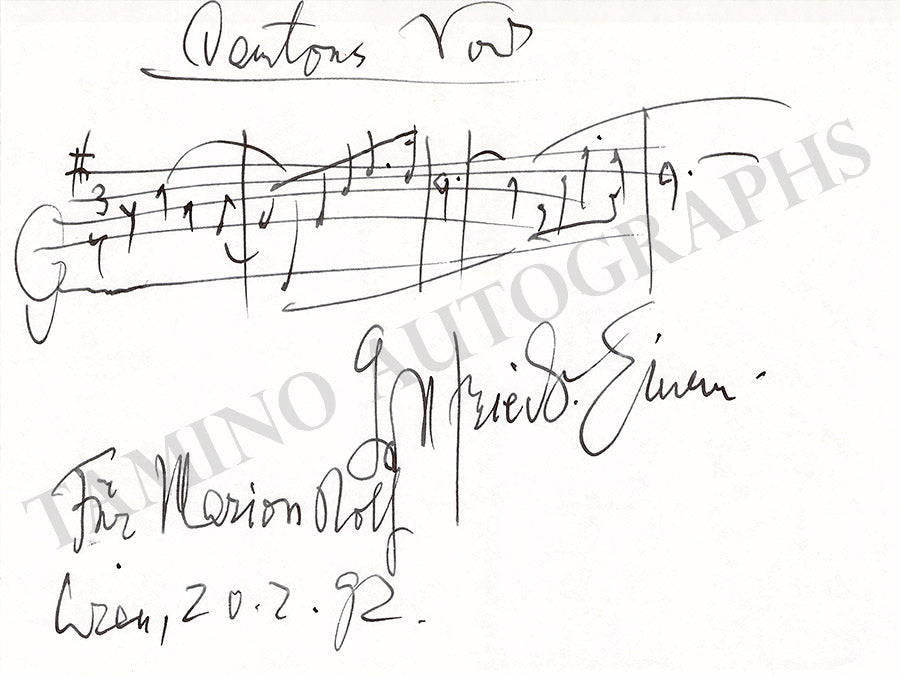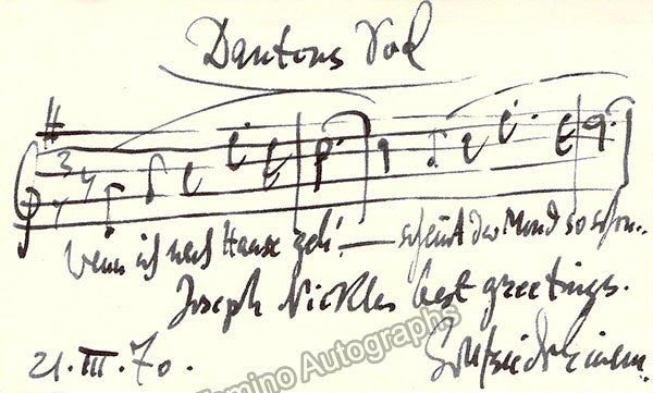 Autograph quote on a card signed and inscribed by the composer with 3 bars of music from his work 'Dantons Tod' (1947), dated in 1970 plus some lyrics below and a short text on the verso as well. Size is 5 x 3 inches, in excellent condition.