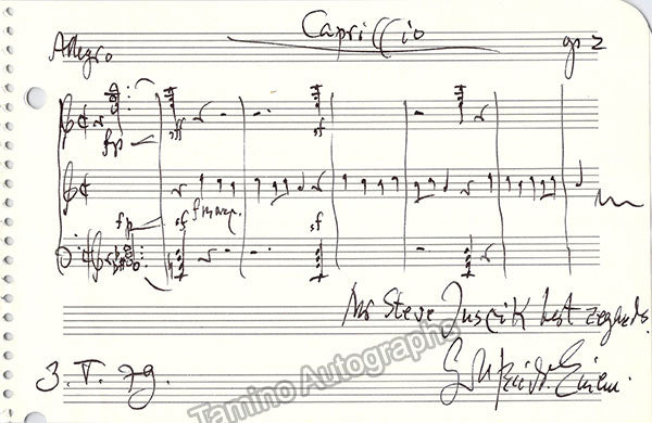 Autograph music quote with 7 bars from his work 'Capriccio' signed and inscribed by him, dated in 1979. Size is 8.5 x 5.5 inches, in excellent condition.