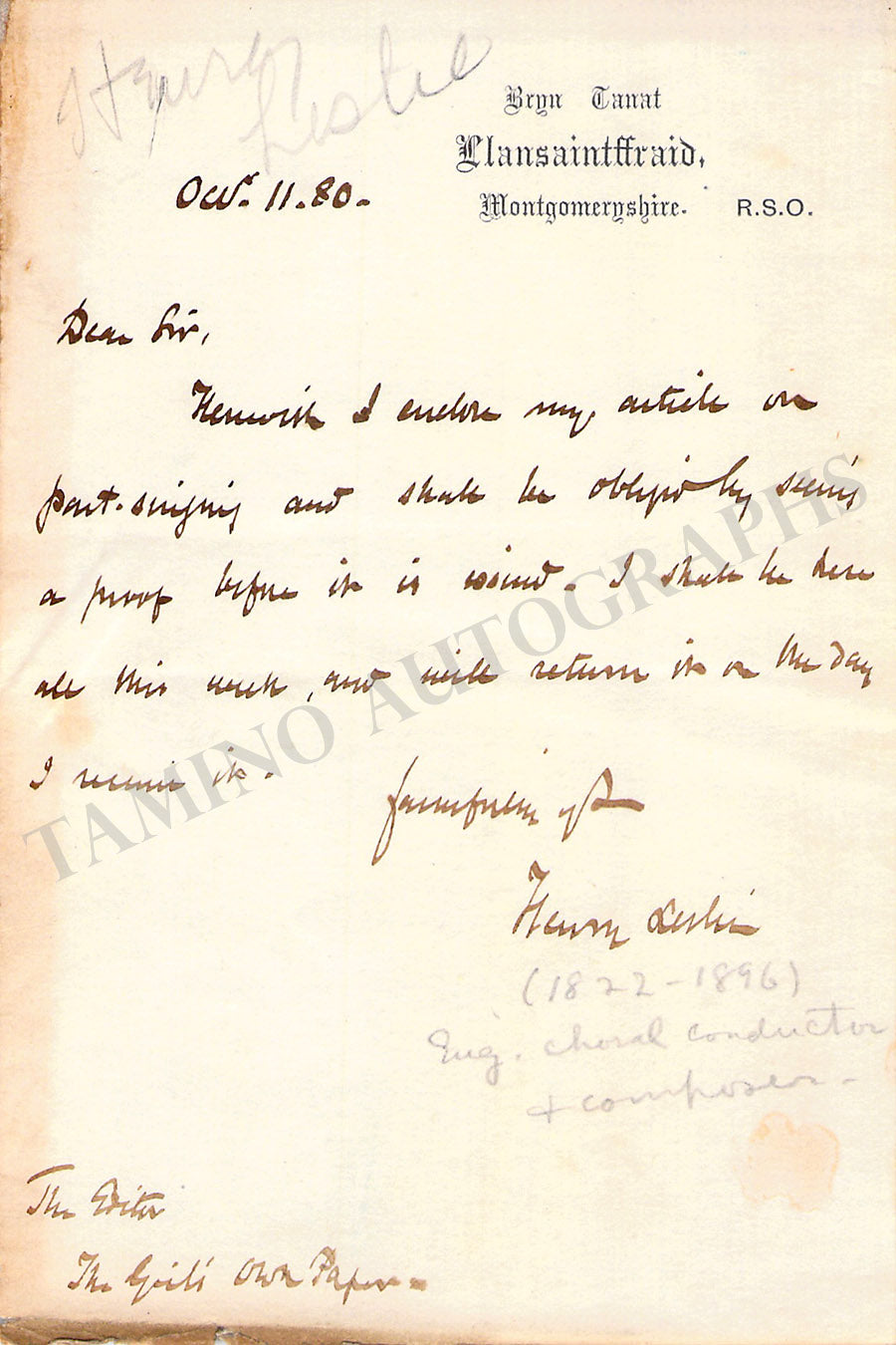 Autograph letter in English signed by him, dated Oct. 11, 1880, to the editor of “The Girls’ Own Paper”: