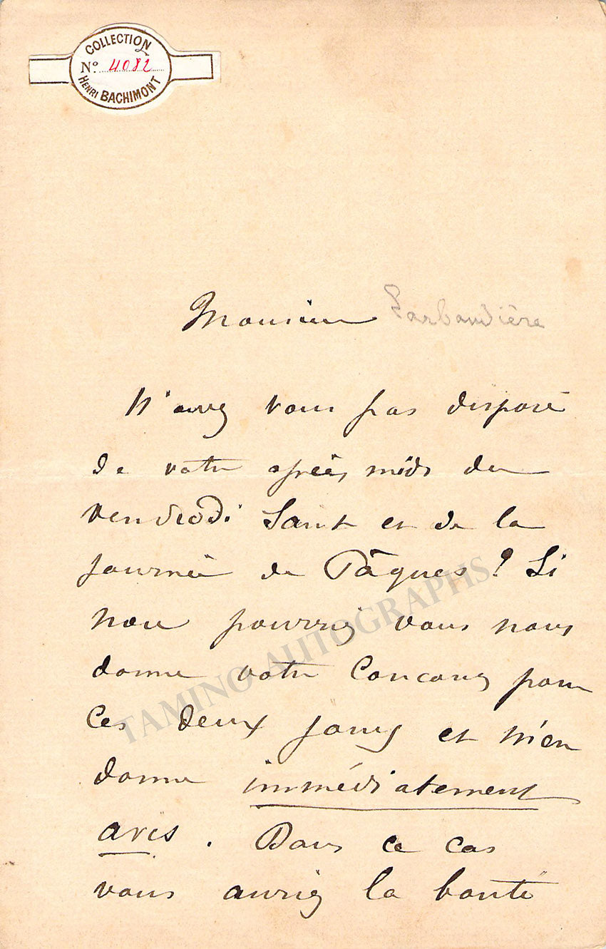 Autograph letter in French signed by him, no date mentioned, addressed to one of his pupils about rehearsals and appointments.  Size is 4.4 x 6.9 inches, 2 written pages in one sheet (front and back), translation not included, folds, in overall excellent condition.