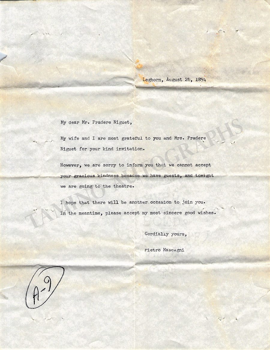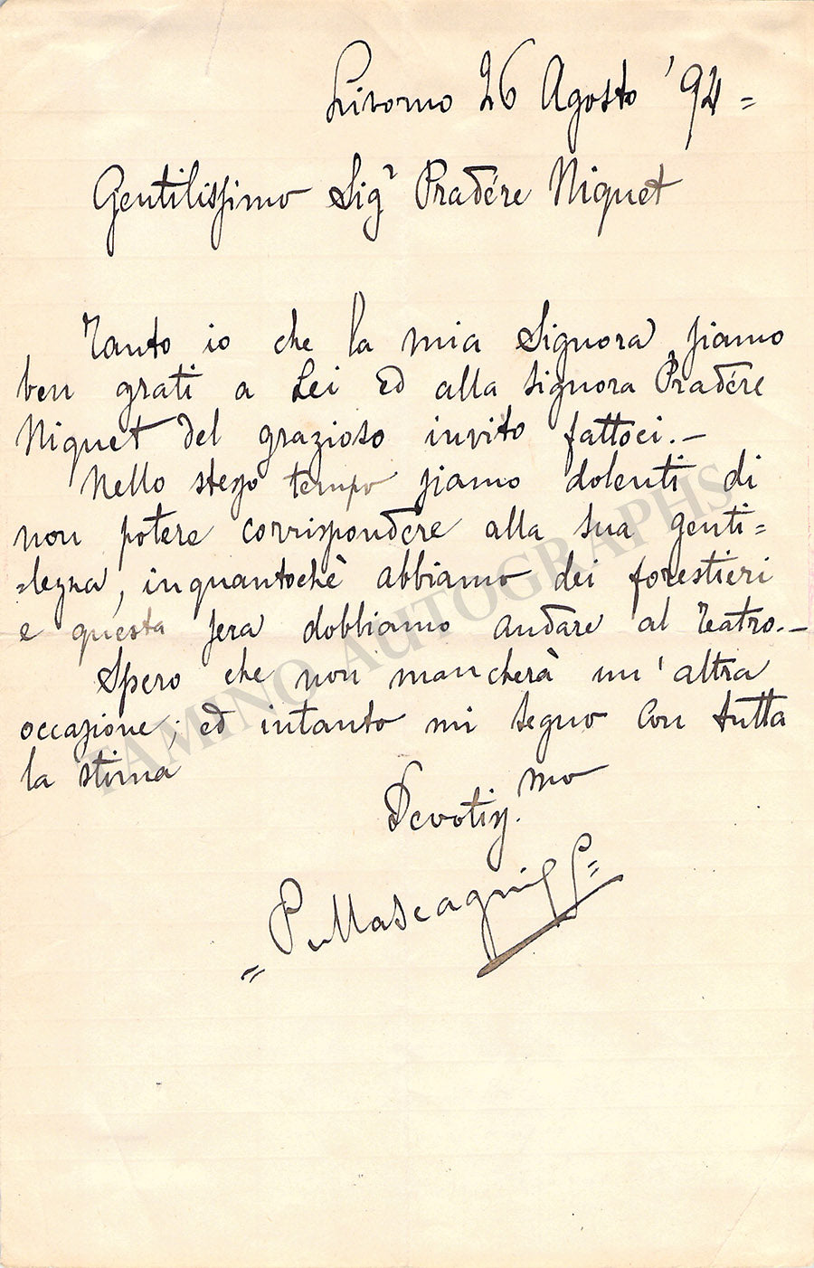 Autograph letter in Italian (sold with translation) signed by him responding to an invitation, dated in Livorno, August 28, 1894. Size is 5.25 x 8.25 inches, 1 page, in very good condition.