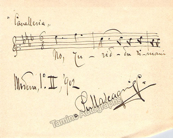Beautiful 3-bar autograph music quote from his opera Cavalleria Rusticana signed by him in Modena, 1902. Size is 5 x 4 inches, in very good condition.