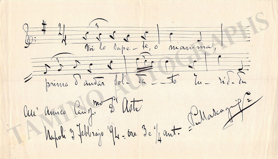 Fantastic autograph music quote with the 5 opening bars of Santuzza's aria from his famous opera Cavalleria Rusticana signed and inscribed by him with a short sentiment dated in Naples, 1894. Size is 7.9 x 4.5 inches, in excellent condition.