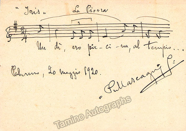 Autograph music quote on an album page signed by the composer with 4 bars from his opera Iris, dated in Palermo, 1920. Size is 4.75 x 6.75 inches, in excellent condition.