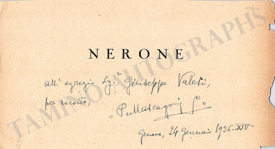 fine clip (a piece from a page from the printed score of his opera Nerone) signed and inscribed by him and dated 1936. Size is 8.8 x 4.8 inches, right border irregularly cut, otherwise in excellent condition.