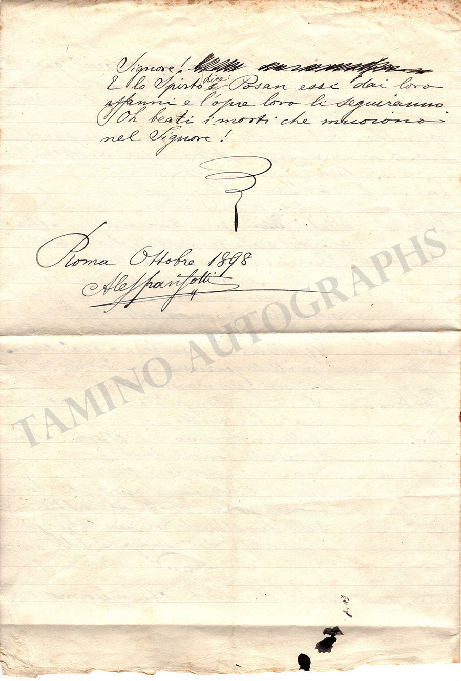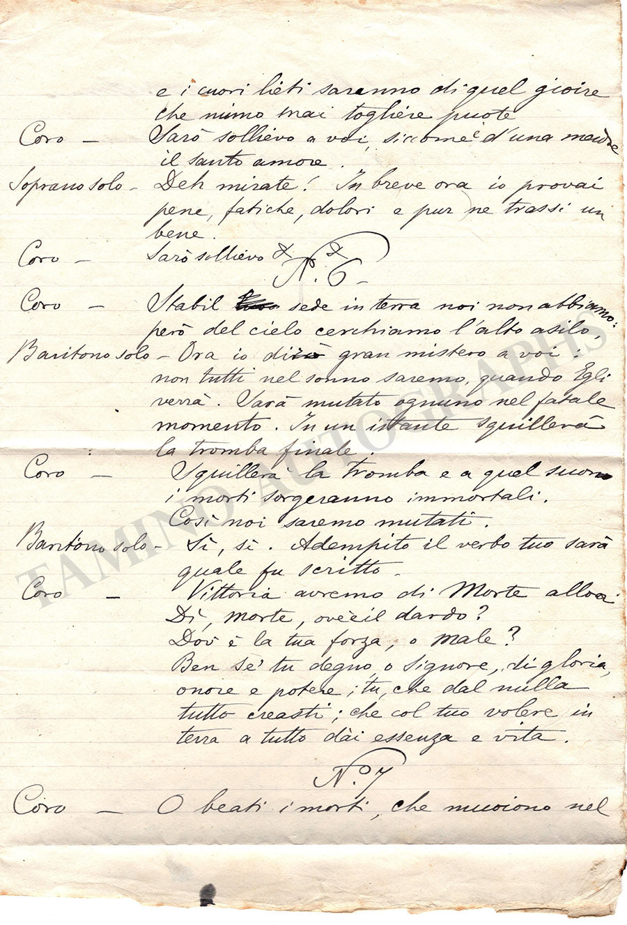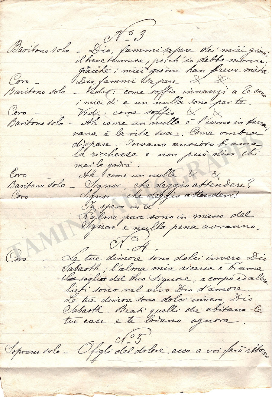 Autograph manuscript with the Italian translation of Brahms' German Requiem made for the first Italian performance in 1898. Size is 8.6 x 12.5 inches approx., 4 pages, overall rust stains, some smudges and corrections over the text, in overall very good condition.