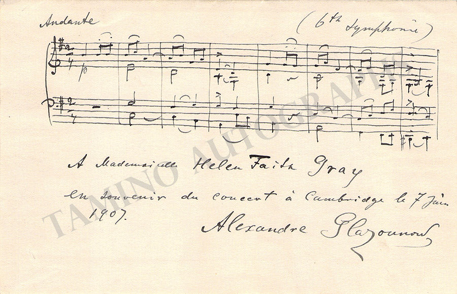 Autograph 8-bar music quote from his Symphony Six's andante signed and inscribed by him at the bottom. Size is 6.9 x 4.5 inches, in very good condition.