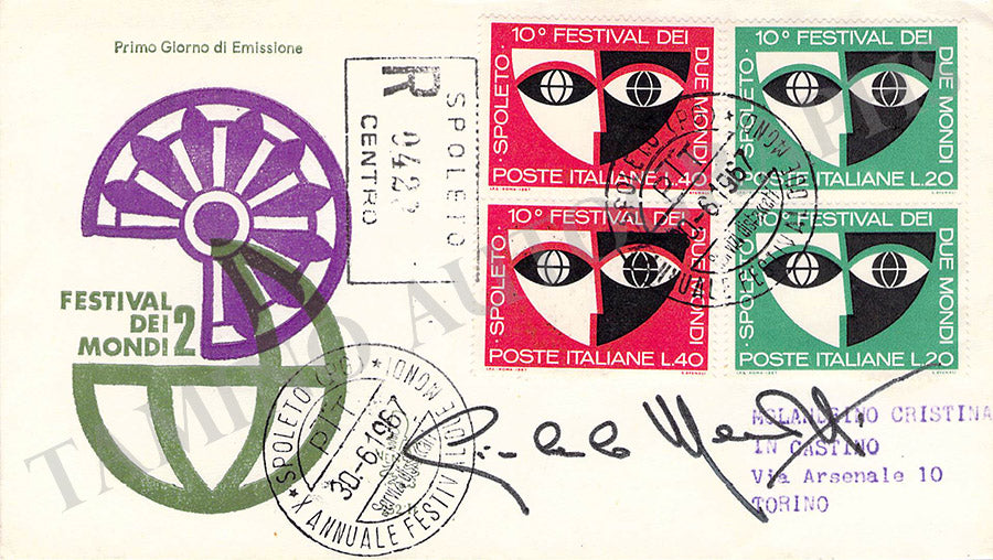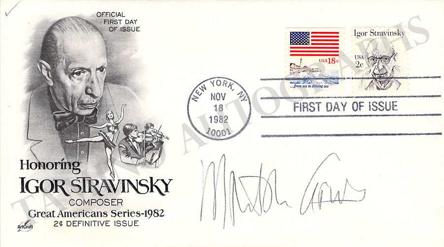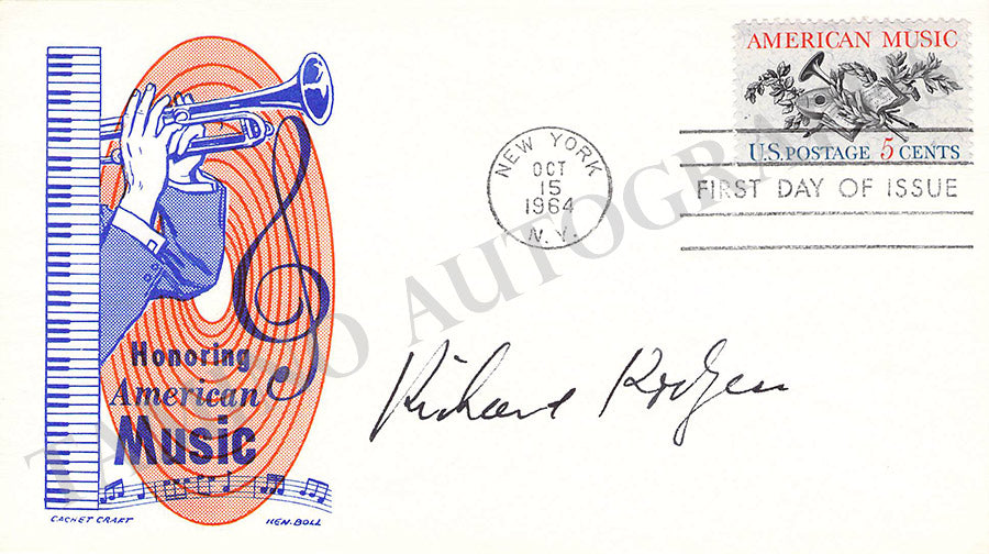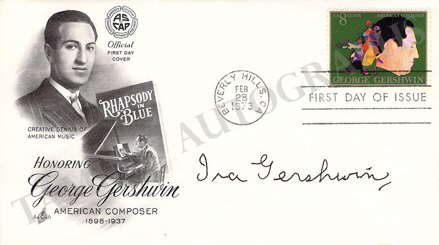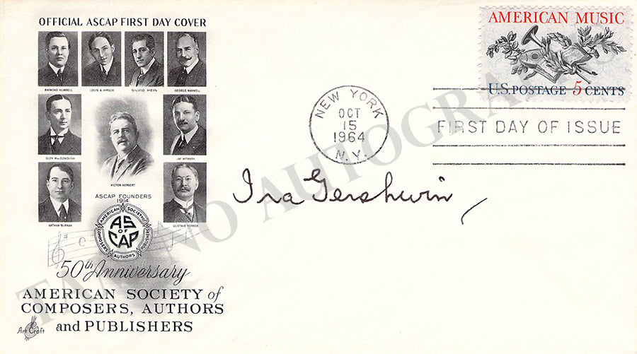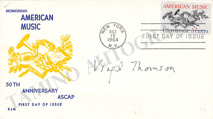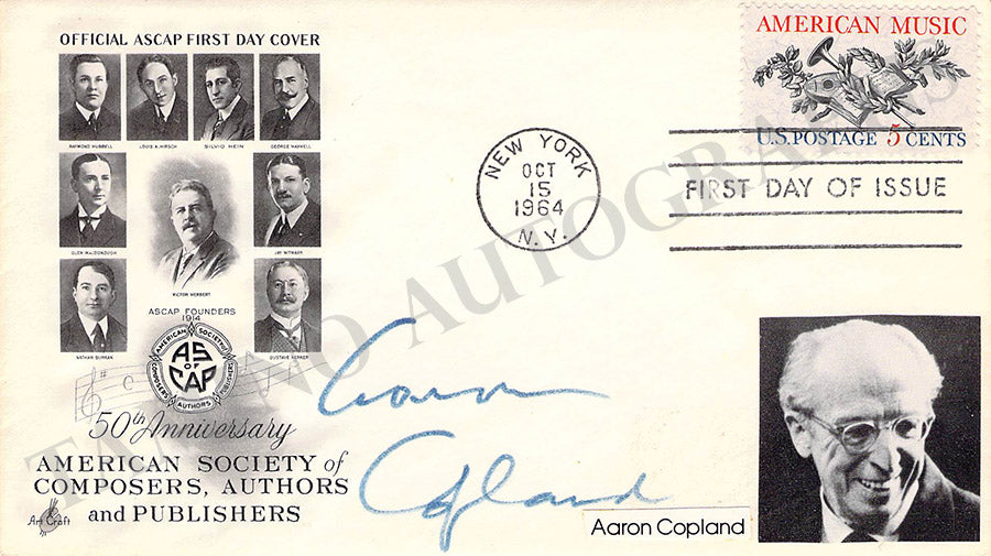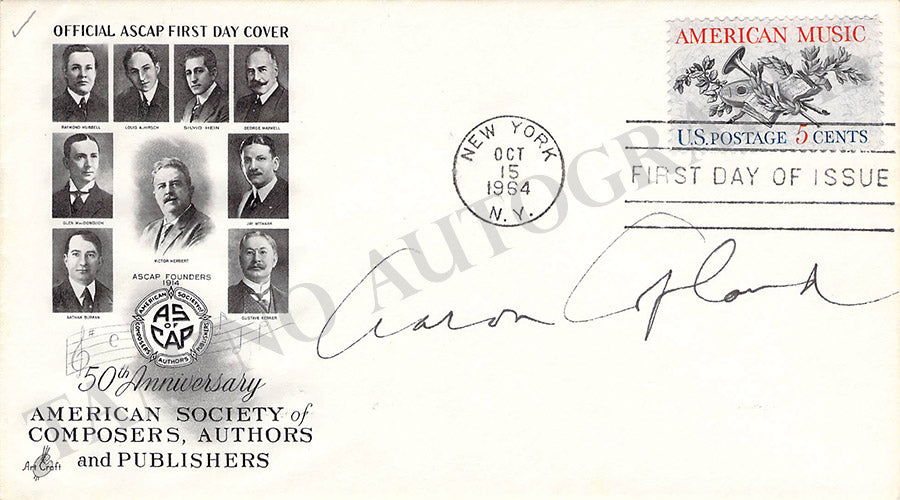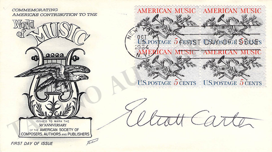 Beautiful collection of 11 original first day cover commemorative issues (envelopes) signed by American composers Aaron Copland (2), Elliott Carter, Ira Gershwin (2), Irving Berlin, John Cage, Morton Gould, Richard Rodgers, Virgil Thomson, Samuel Barber, and Italian-born Gian Carlo Menotti.