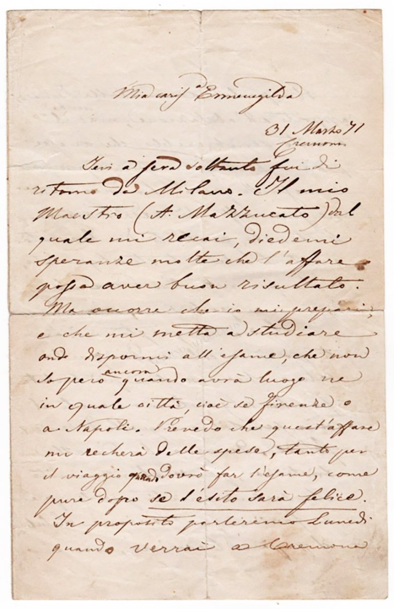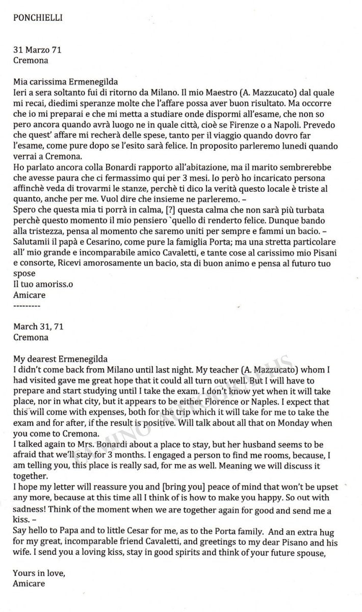 Autograph letter signed, dated in Cremona, March 1st, 1871, to a lover (calling himself her future husband), called Ermenegilda - who ended not being his wife. Ponchielli ended marrying Brambilla in 1874. Ponchielli mentions his teacher, an upcoming exam, and other personal businesses.