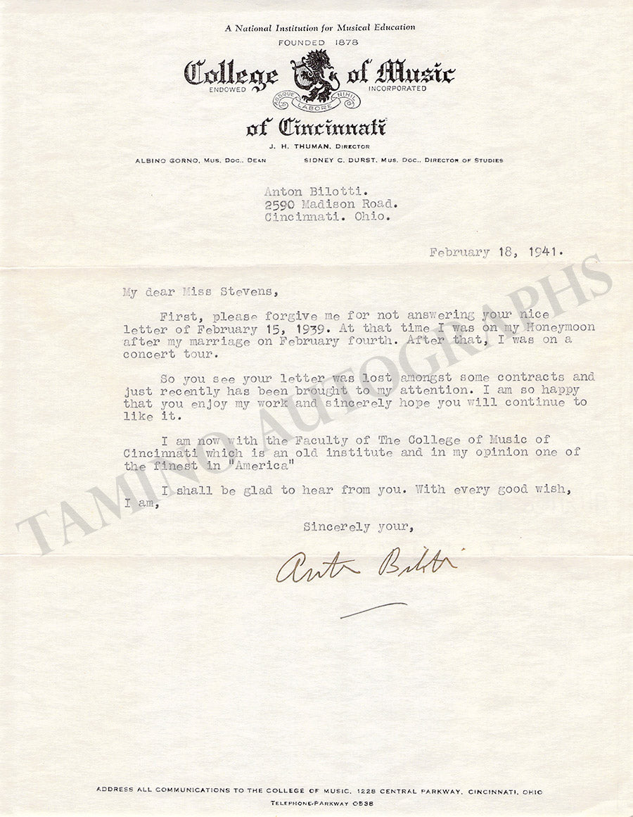 Typed letter with the letterhead of the College of Music Cincinnati signed by him in 1941. Size is 8.5 x 11 inches, 1 page, folds, in excellent condition.