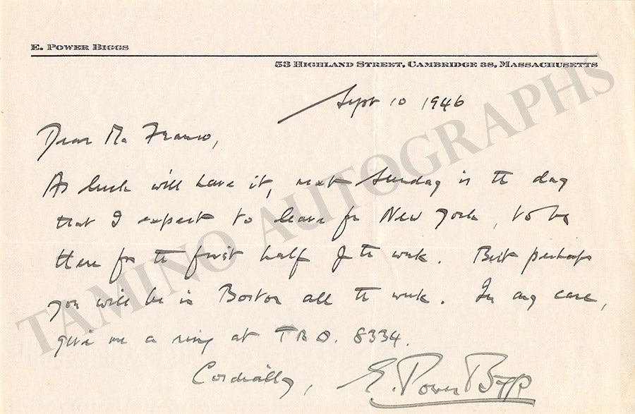 Autograph letter signed by him, dated Sept. 10, 1946, to the American composer Johan Franco (1908-1988): «...As luck would have it, next Sunday is the day that I expect to leave for New York to be there for the first half of the week. But perhaps you will be in Boston all the week...».