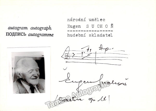 2-bar autograph music quote signed by him on a card attached with a small photo of him. Size is 5.75 x 4.1 inches, in excellent condition.
