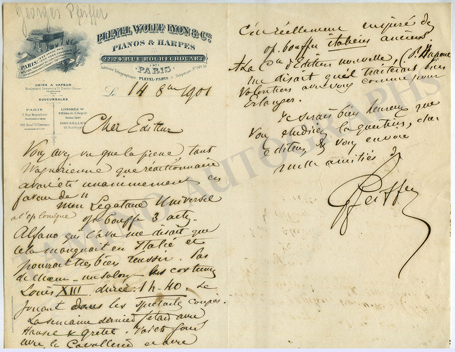Autograph letter in French (untranslated) signed by him, dated October 14, 1901, to a music publisher: “…Vous avez vu que la piece tant wagnerienne que réactionnaire avait été unanimement ces faveur de l’opera comique. Mon Légataire universel op. bouffe 3 actes. Alfano qui … me disait que cela manquait en Italie et pourrait être bien réussir…”