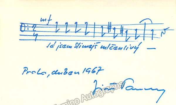 Autograph quote on a card with 3 bars of music (probably from one of his works) signed and dated by him in Prague, 1967. Size is 5 x 3 inches, in excellent condition.