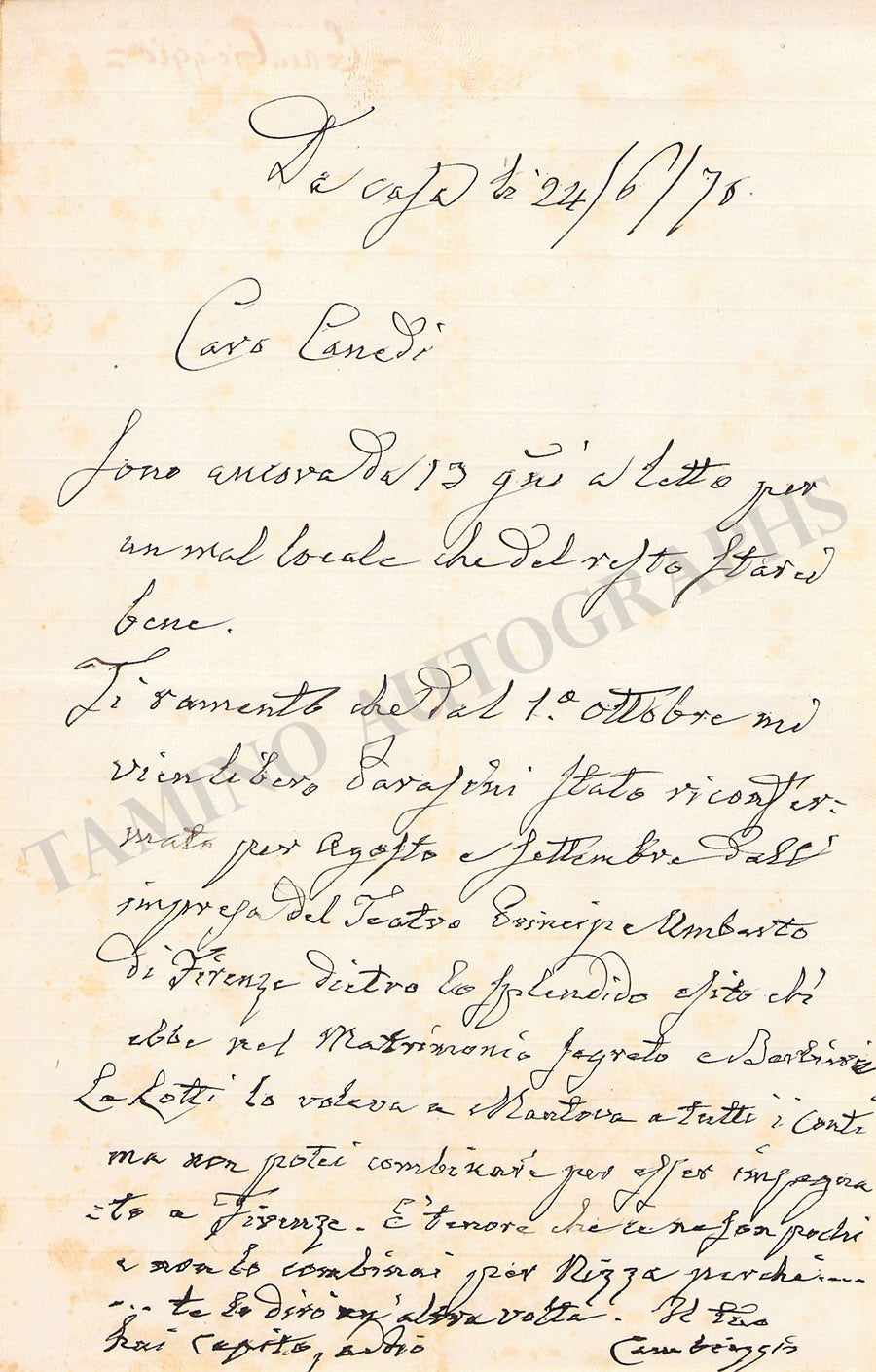 Autograph letter in Italian (untranslated) signed by him, dated 1876, addressed to the impresario Innocenzo Canedi, about singers and their engagements for opera performances.