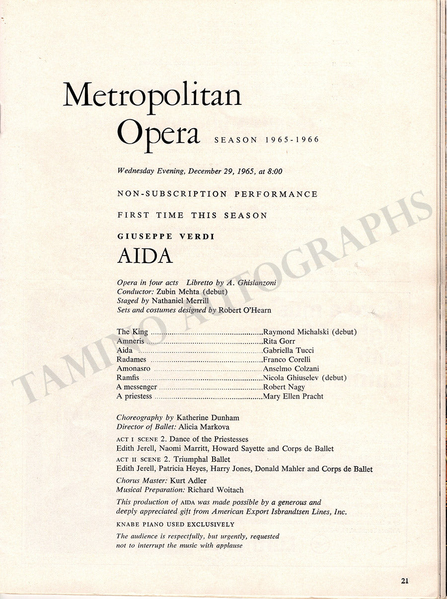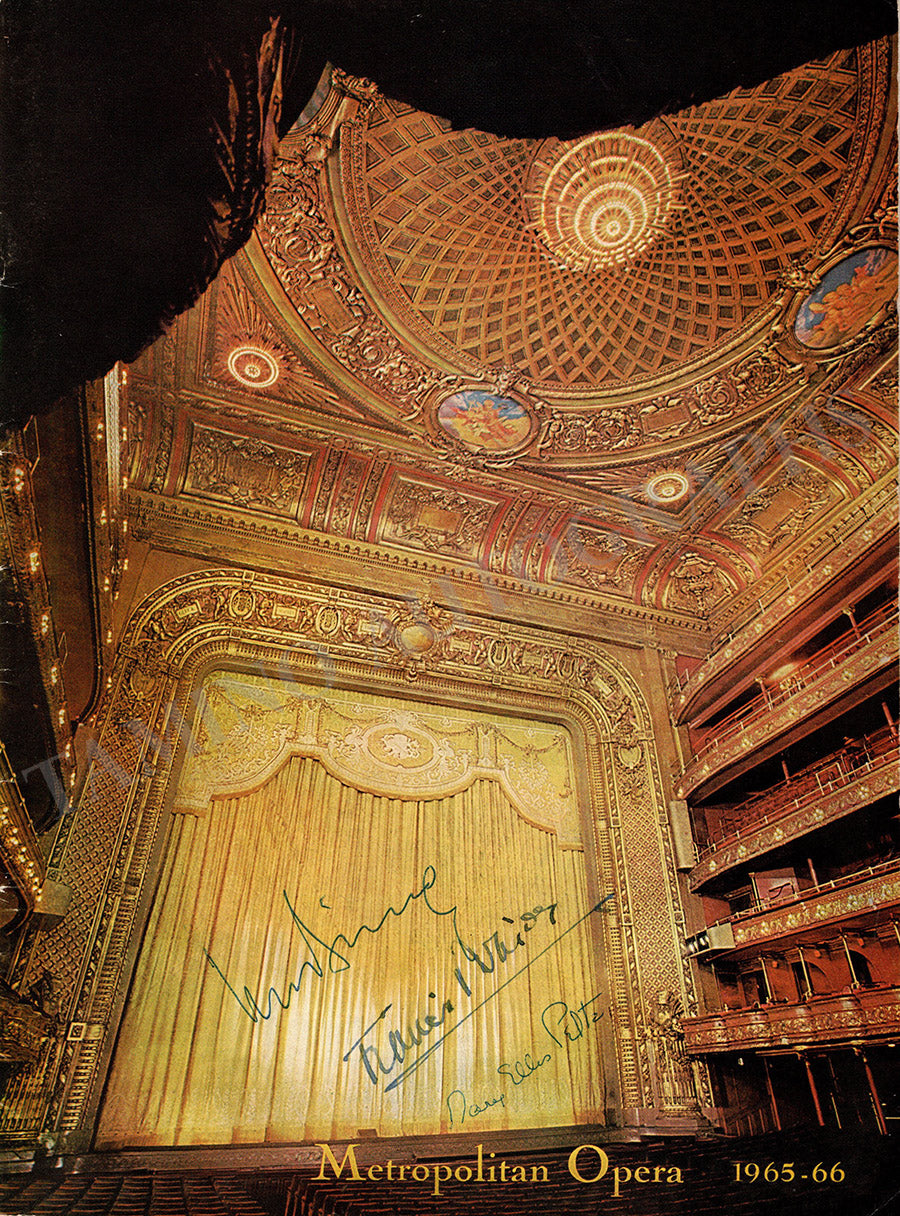 Program for a performance of Verdi's Aida at the Metropolitan Opera House, New York, on December 29, 1965, signed by him on the cover. Also signed by Mary Ellen Pracht and an unidentified other. Size is 8.1 x 10.8 inches, full program with all pages and covers, in excellent condition.