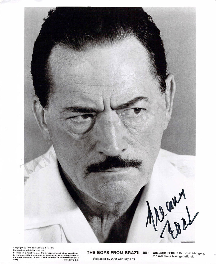 Black-and-white movie-still promo photograph signed by him, shown in the film 'The Boys from Brazil' (1978). Size is 8.1 x 9.75 inches, in excellent condition.