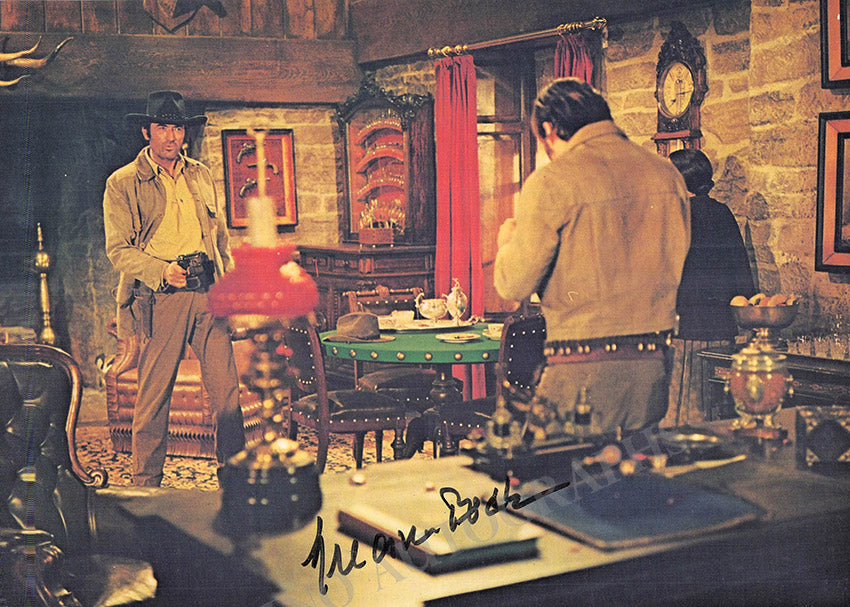 Nice color half-tone screenshot photograph signed by him, shown in the film 'Shoot Out' (1971). Size is 10.25 x 7.5 inches, in excellent condition.