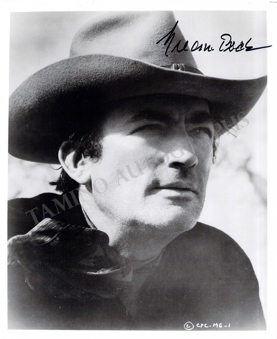 Nice black-and-white photograph signed by him, shown in the Western film 'Mackenna's Gold' (1969). Size is 8 x 9.75 inches, in excellent condition.