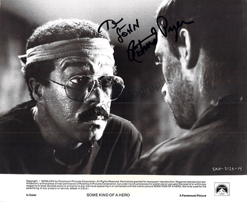 Fine promo photograph of the film "Some Kind of a Hero" (1982) signed by him. Size is 9.9 x 8.1 inches, in very good condition (horizontal lines appearing in the photo caused by the scanner, not in the actual photograph).
