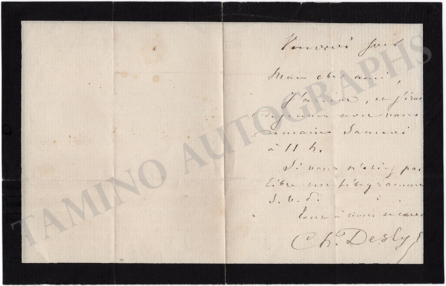 Autograph note in French (untranslated) signed by him, no date, and addressed to a gentleman, concerning a meeting. Open size is 8.1 x 5.2 inches, 1 written page in one folded sheet, rust and dirt stains, folds, creases, in overall very good condition.