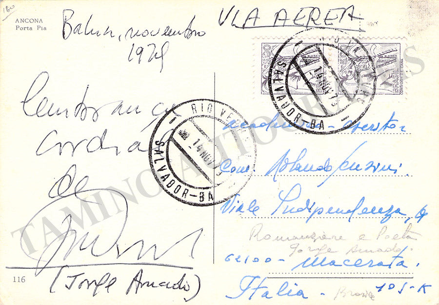 Regular postcard with the image of the Porta Pia in Ancona, Italy (not shown), signed by him on verso with a short sentiment. Size 4 x 5,75 inches, postal markings on verso, some ink-writing by a third hand, in overall very good condition.