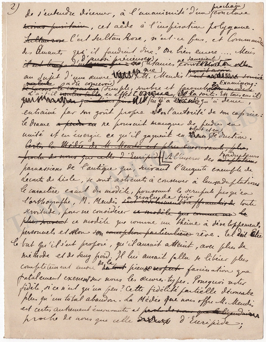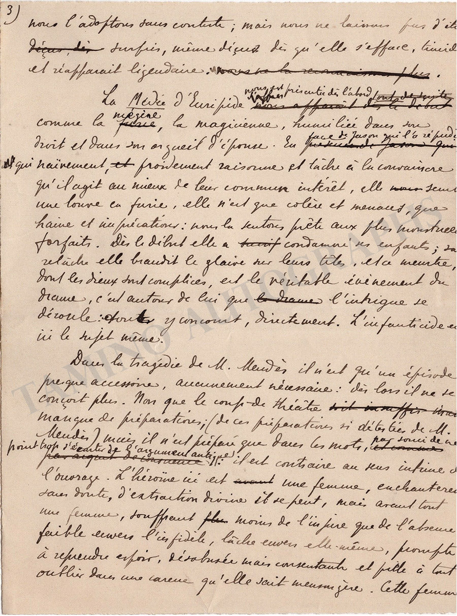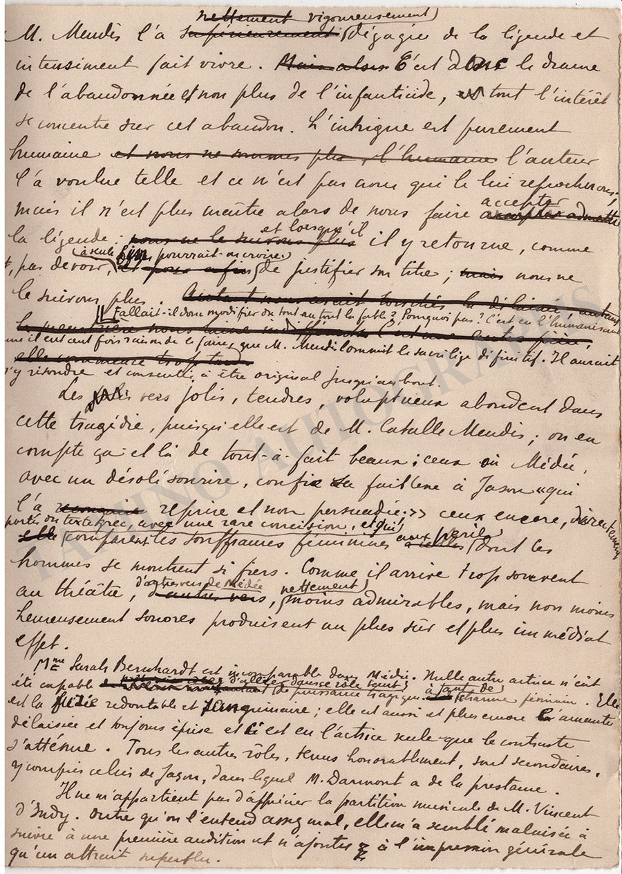 Autograph draft of an article for the column "La Quinzaine Dramatique" in the magazine "La Revue Blanche", concerning Vincent d'Indy's suite "Medée" (1898) with words by Catulle Mendès.
