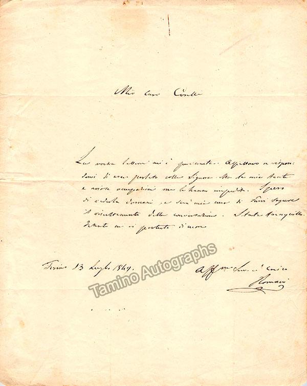 Autograph letter signed, dated in Turin, 1849. One page, in Italian (sold untranslated), sized 8.25 x 10.4 inches, in excellent condition.