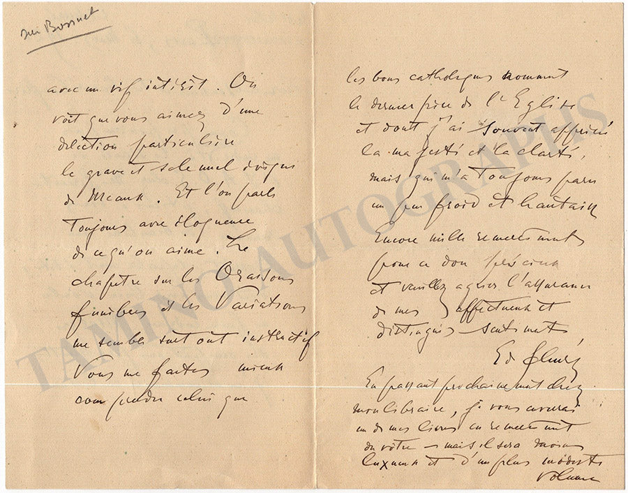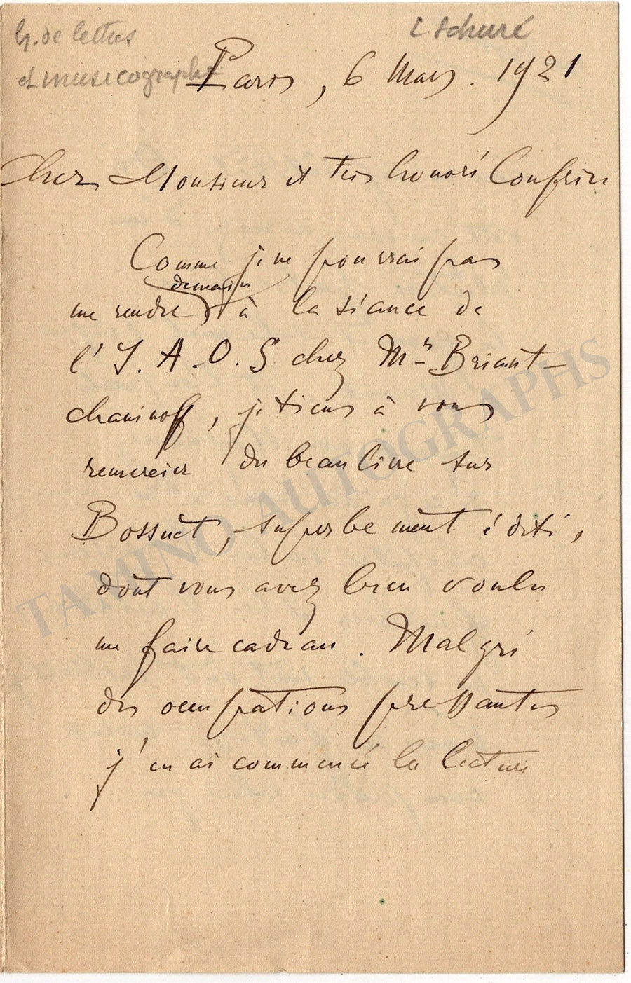 Autograph letter in French signed by him, dated in Paris, March 6, 1921, where he addresses a gentleman, concerning Bossuet's music connections. Size is 4.4 x 6.9 inches, 3 written pages, vertical fold, in very good condition.