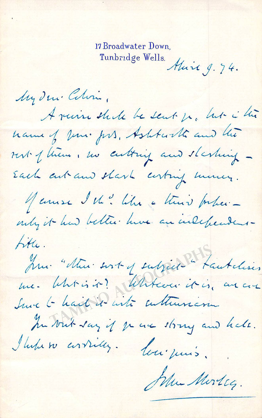 Autograph letter in English signed by him, dated 1874. Size is 4.3 x 7 inches, 1 page, folds, in excellent condition.