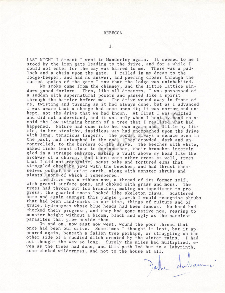 Typed page with the famous opening paragraphs of her Gothic novel Rebecca (1938) signed by her at the bottom. Size is 8.5 x 11.6 inches, 1 page, in very good condition.