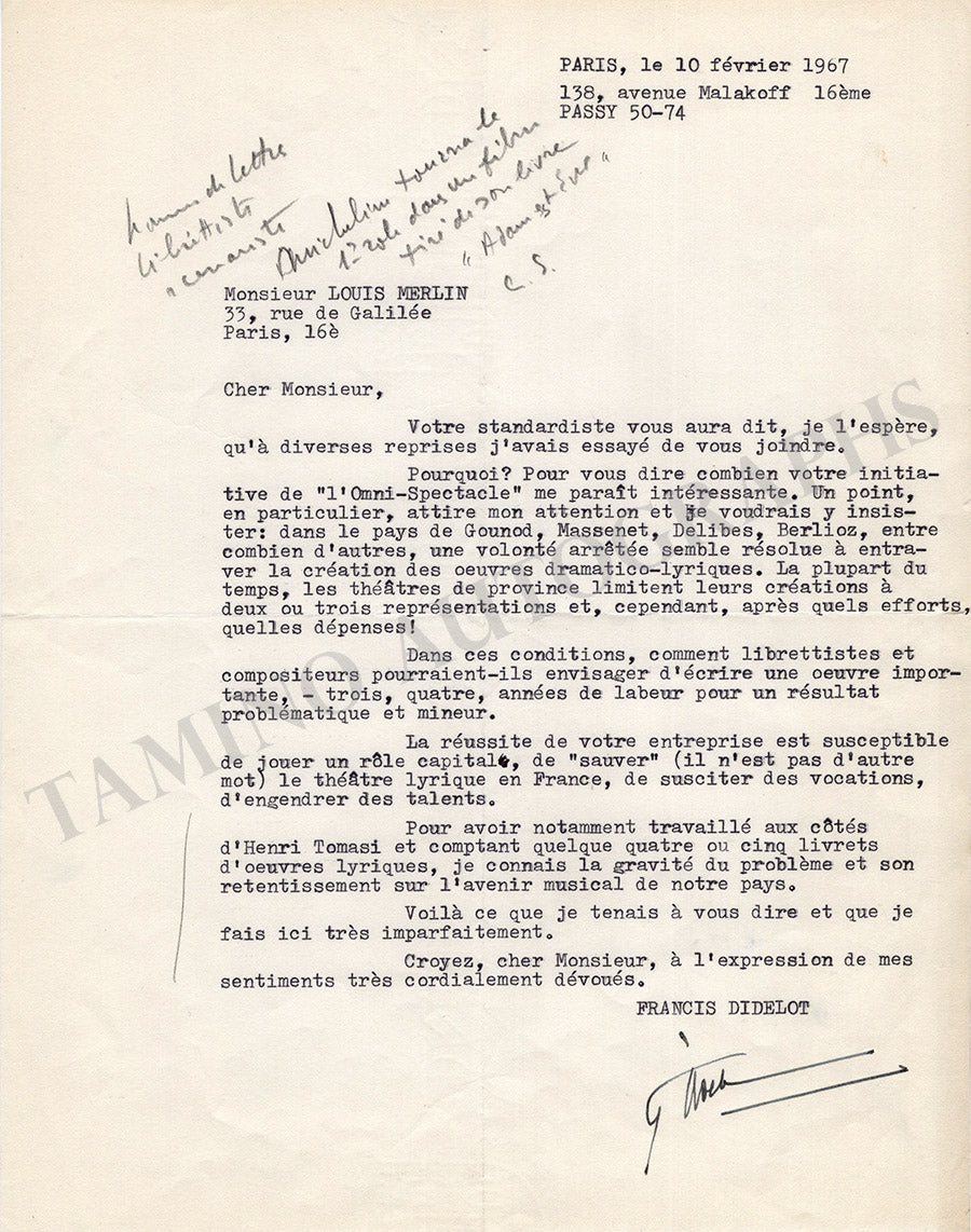 Typed letter in French (untranslated) signed by him, dated in Paris on Feb 10th, 1967. Size is 8.25 x 10.6 inches, 1 written page, in excellent condition.