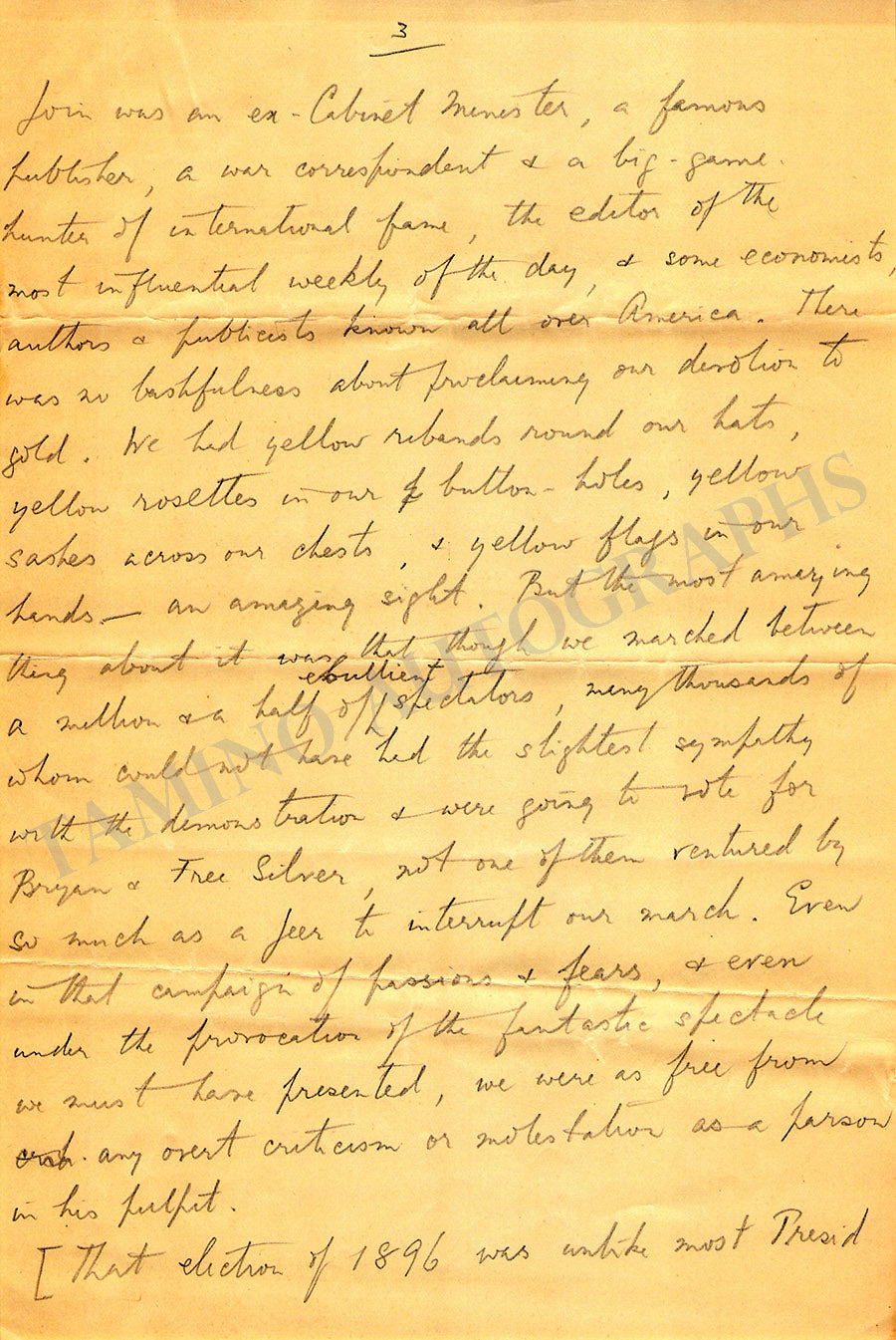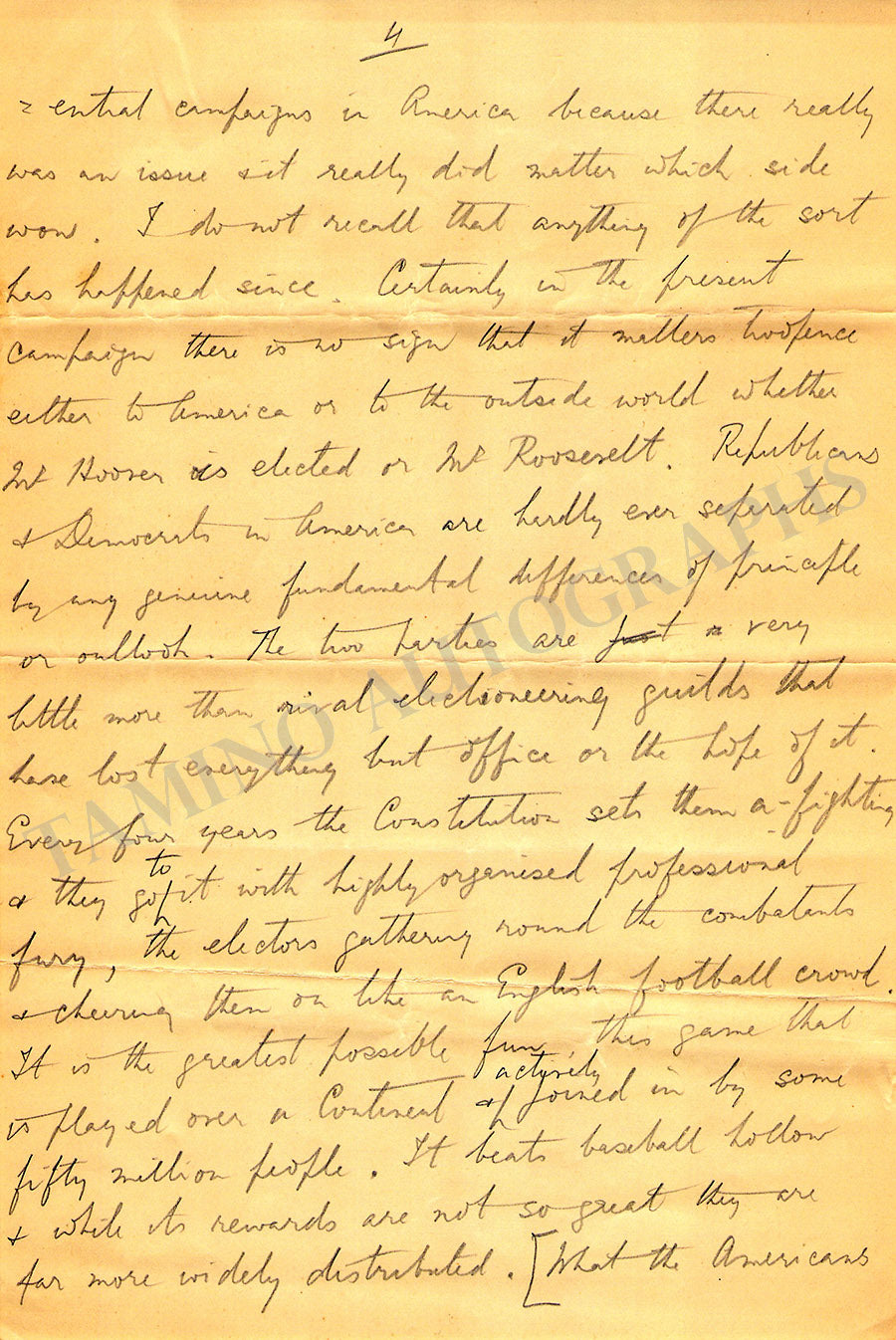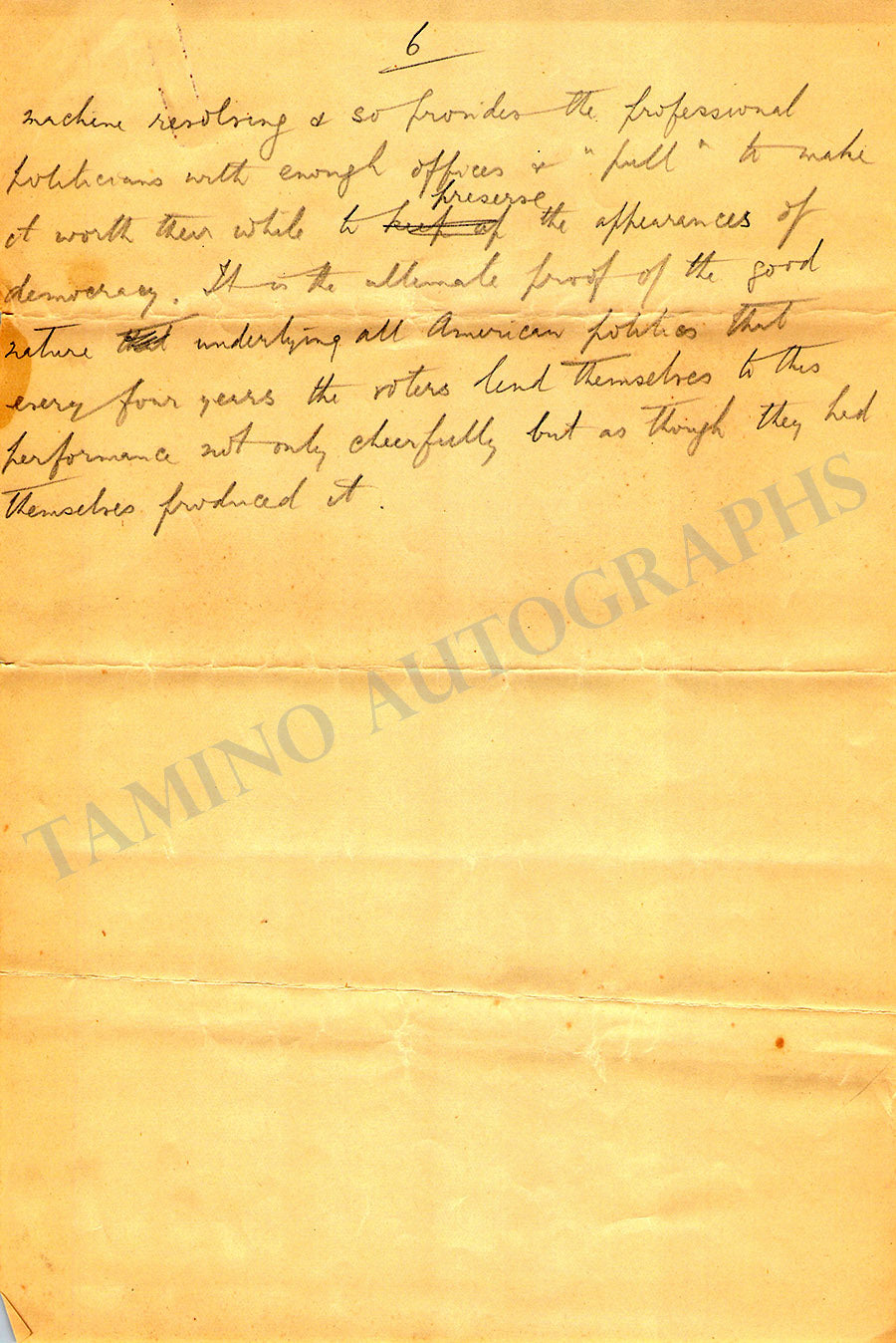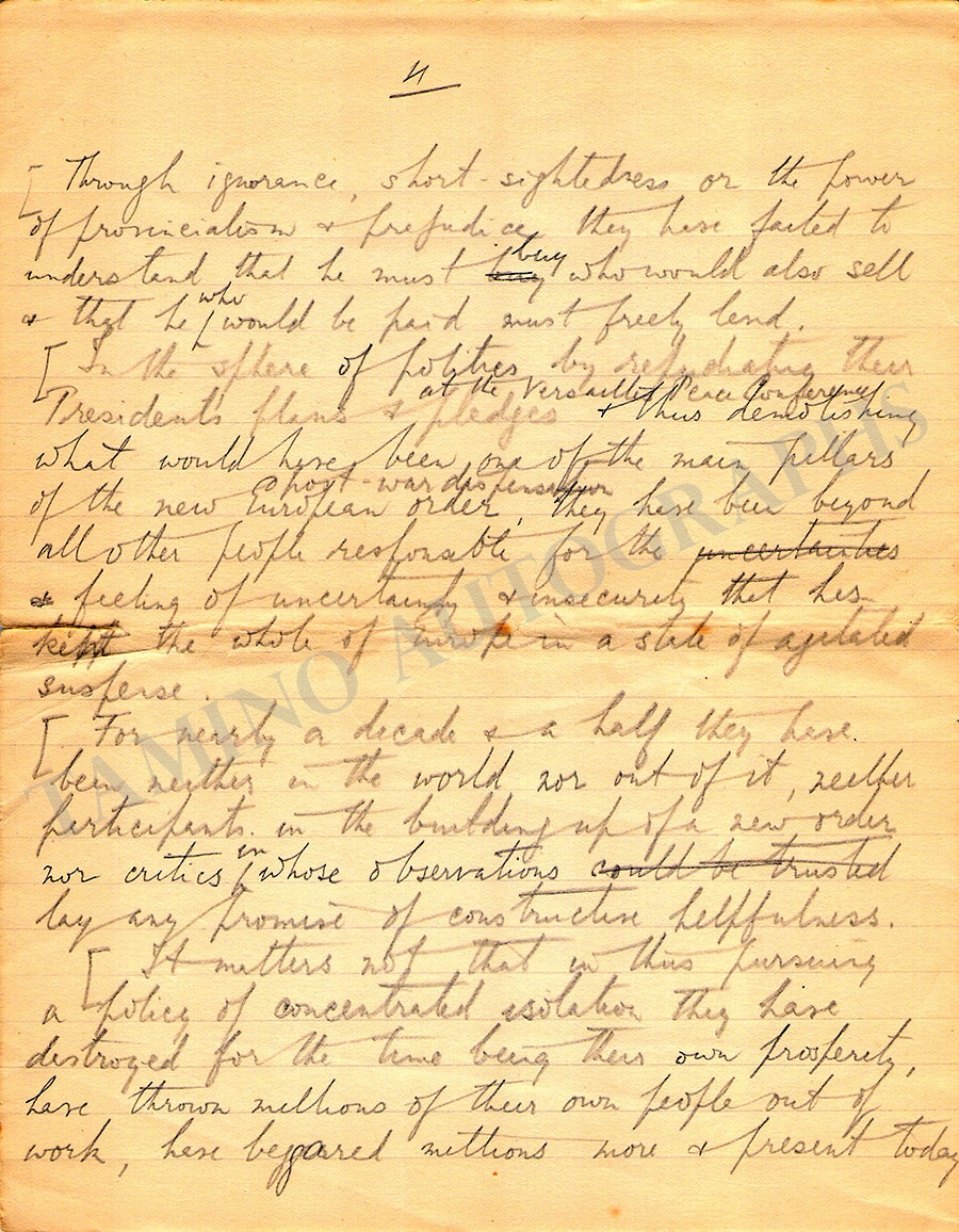 Original 6-page long autograph essay "American Election's Day" written by him in pencil, plus an additional incomplete 4-page long essay by his hand, and one autograph letter signed by his wife on page 2.