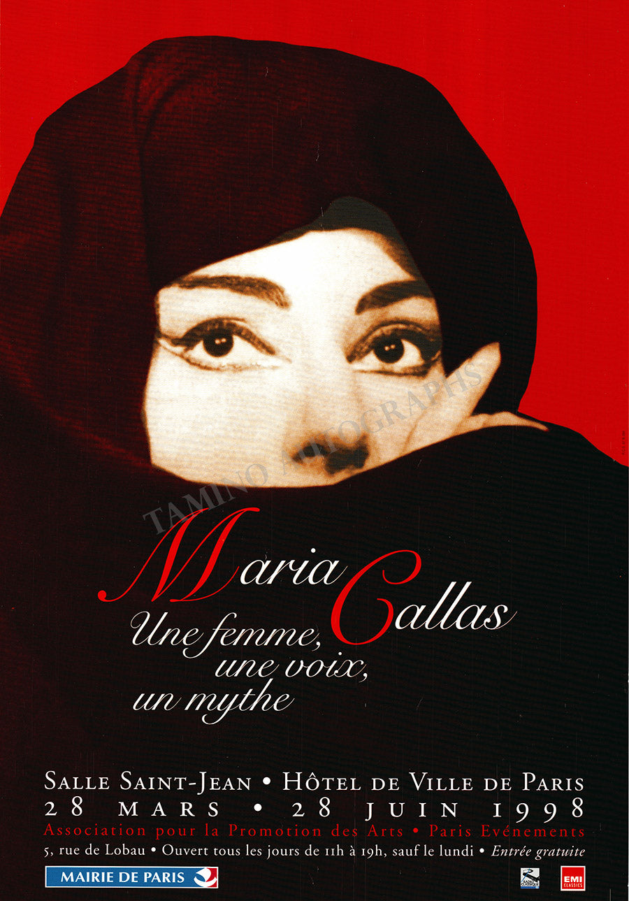 Beautiful poster of the star Greek soprano shown as Medea in Cherubini's opera promoting the exhibit "Maria Callas: A Woman, a Voice, a Myth" in Paris, 1998.