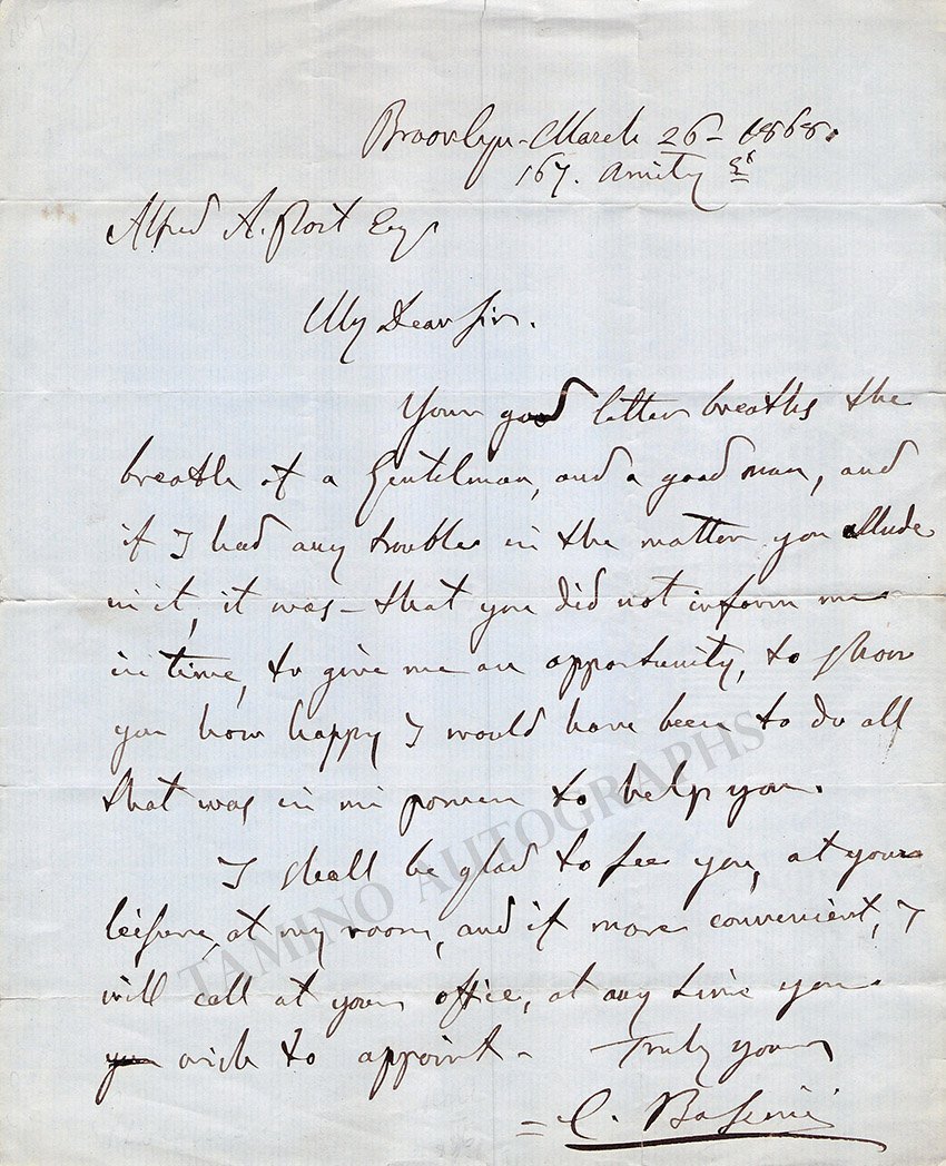 Very rare autograph letter signed by him, dated in New York in 1868, in English, arranging an appointment. One page, 8 x 9.75 inches, minor folds, in excellent condition.