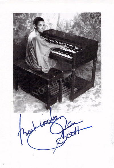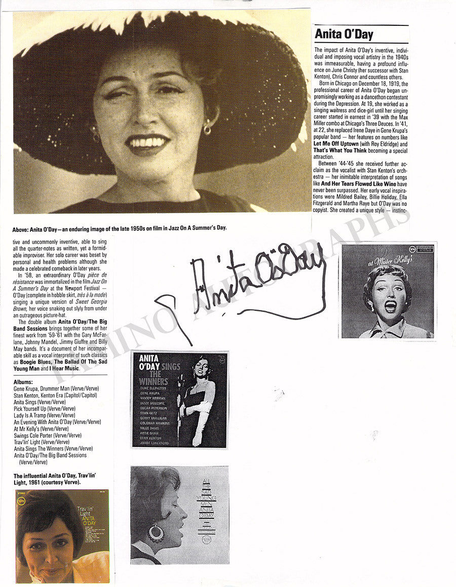 Page with several clips of her recordings and photographs signed by her. Size is 8.4 x 11 inches, in excellent condition.