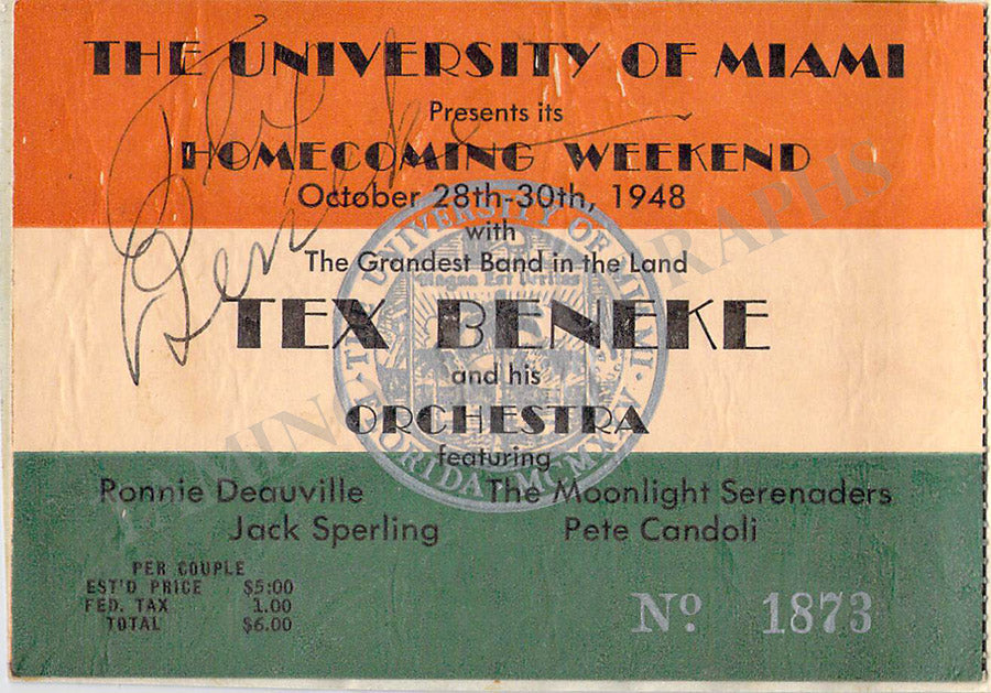 Signed ticket mounted on soft cardboard for a concert in Miami, on October 28, 1948. Size is 4.25 x 3 inches, in very good condition.