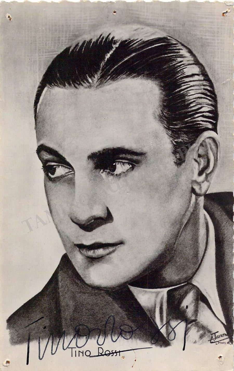 French singer and film actor (1907-1983); active in movies between 1929 and 1982.  Signed half-tone promo photograph shown as himself.  Photo by P.I. Editions, Paris. Size is 3.25 x 5.25 inches, several very small bullet holes at far edges of the photo, otherwise in very good condition.