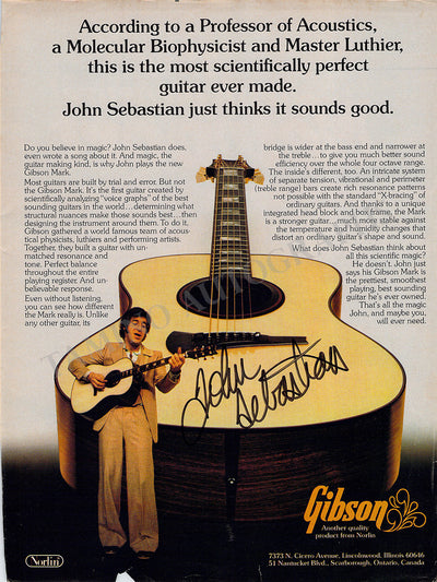 Full page advertisement for Gibson Guitar (a page from a magazine) with a small image of Sebastian, signed boldly by him with a black felt tip pen. Size is 8 x 10.75 inches, small crack over the bottom, irregularly cut left border, otherwise in very good condition.