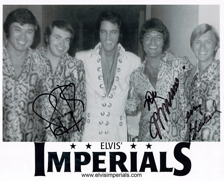 Nice black-and-white promo photograph of the band shown next to Elvis Presley and signed by three of its members including Terry Blackwood and others.  Size is 9.9 x 7.8 inches, in excellent condition.