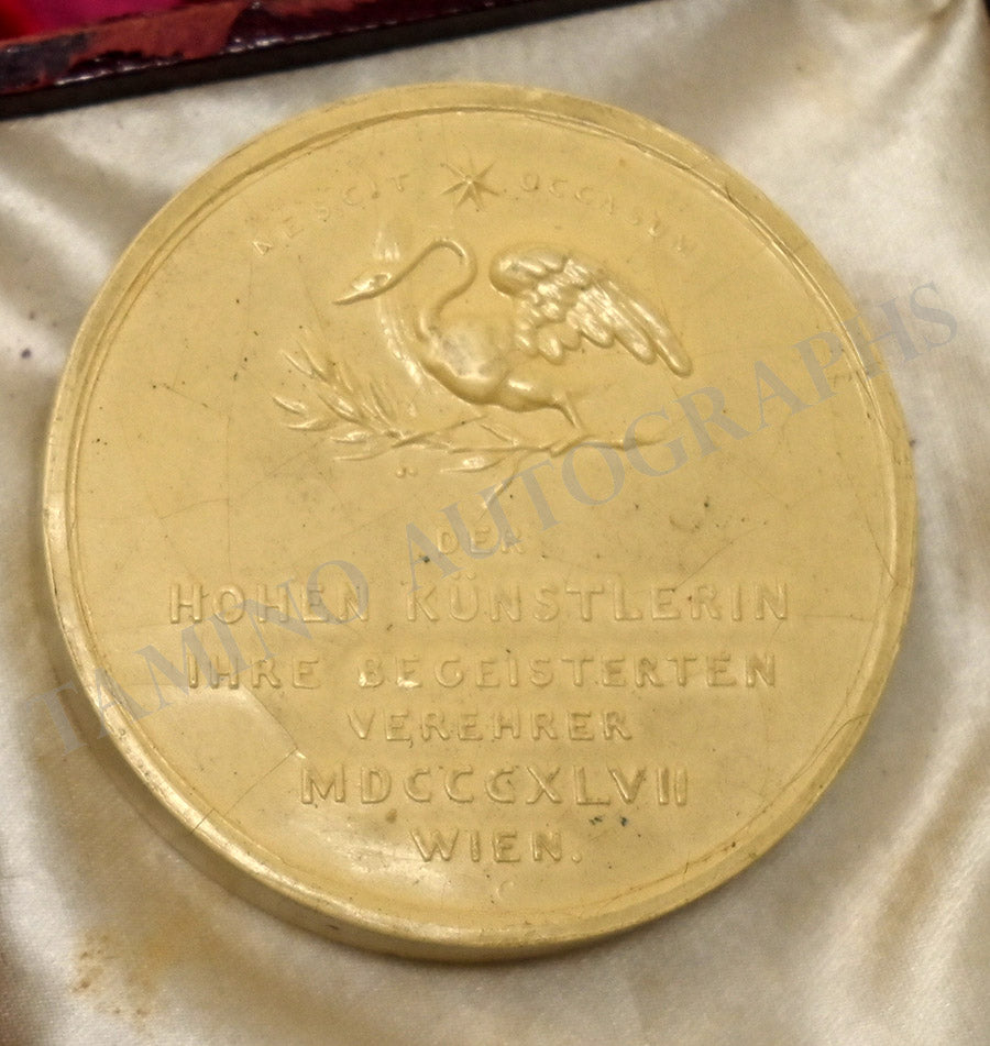 Nice and rare medallion in red velvet case, made by a fan celebrating her career, dated in Vienna, 1847. Medallion's size is 1.7 inches diameter; case is 2.5 x 2.5 inches, in very good condition.