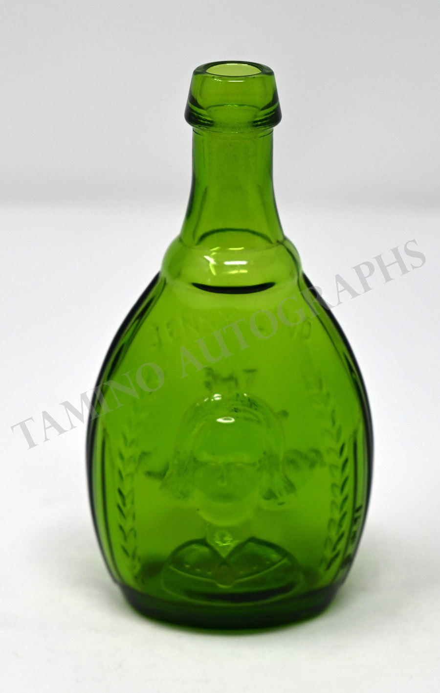 Vintage green bottle with her image on it, with the legend 'The Swedish Nightingale' on verso. Size is 3.5 x 5.5 x 2 inches, in excellent condition.