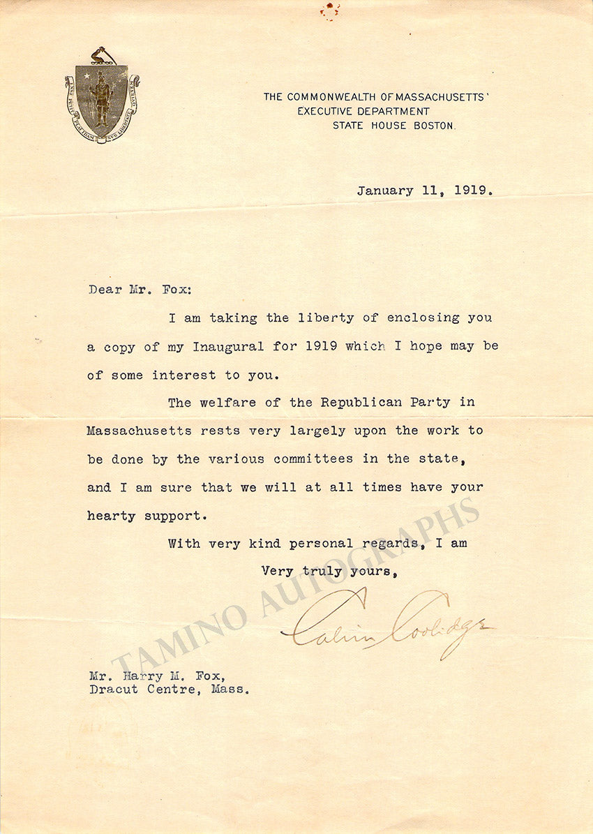 Typed letter with the letterhead of the State House in Boston signed by him, providing a copy of his speeches, dated January 11, 1919. Size is 7.3 x 10.3 inches, folds, otherwise in very good condition.