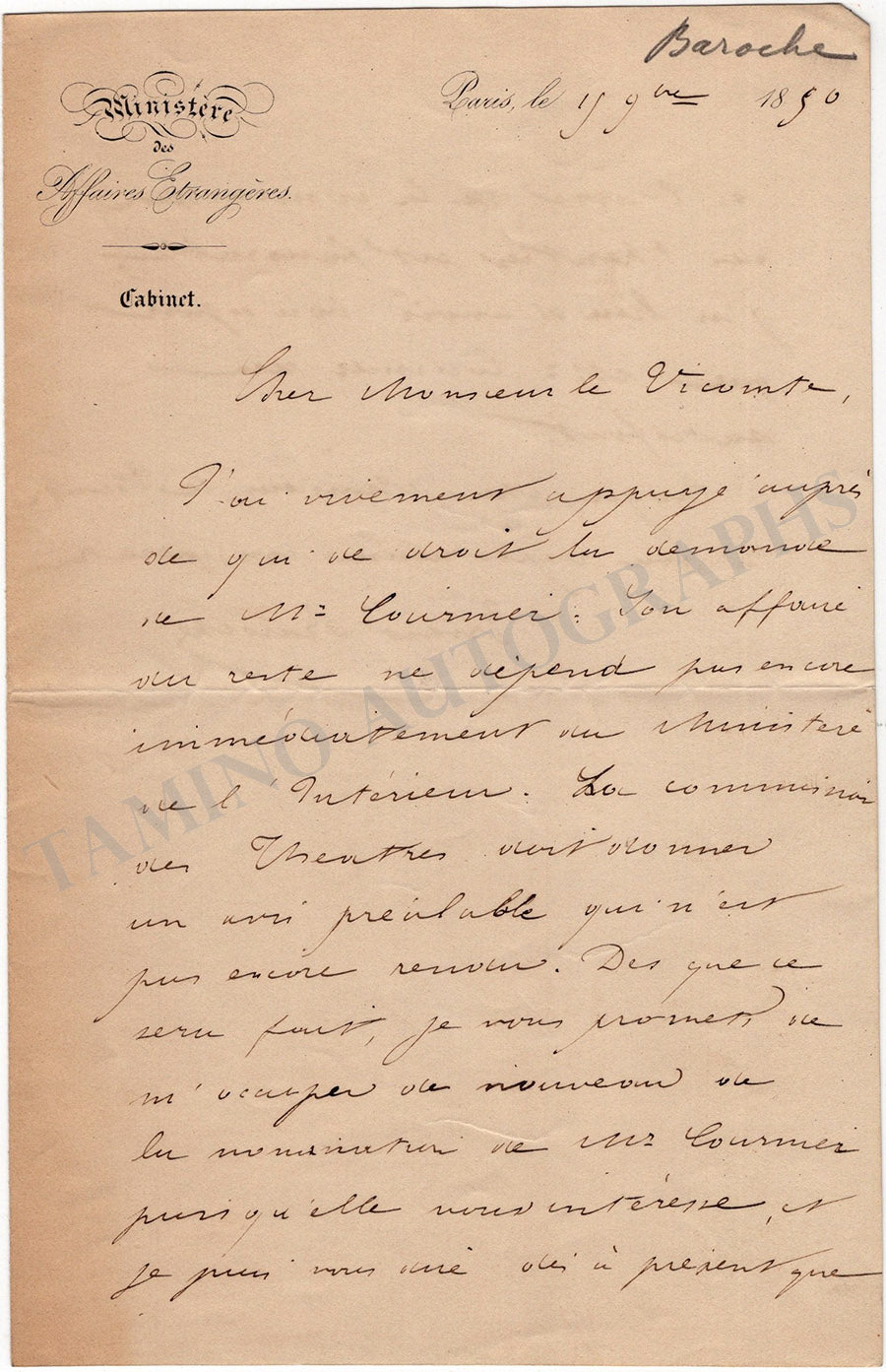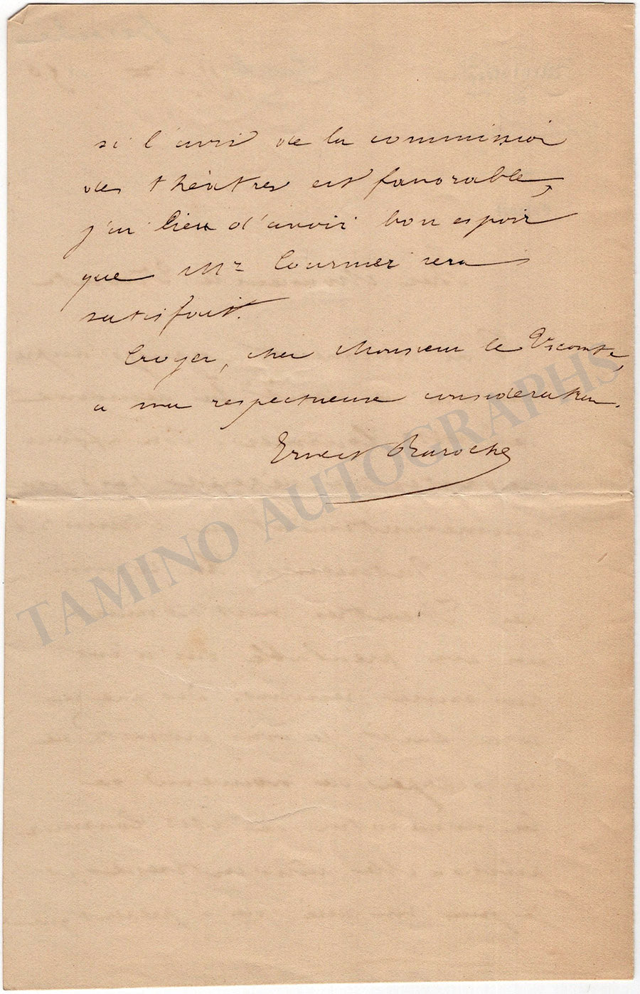 B. Paris le 15 9bre 1850. To a Viscount: “…j’ai vivement appuyé auprès de qui de droit la demande de M. Courmer. Son affaire du reste ne dépend pas encore immédiatement du Ministère de l’Intérieur. La commission des Théâtres doit donner un avis préalable qui n’est pas encore rendu. (…) Je puis vous dire dès à present que si l’avis de la commission des théâtres est favorable j’ai lieu d’avoir bon espoir que Mr. Cormer sera satisfait…”. 1 p. ½. In-8.
