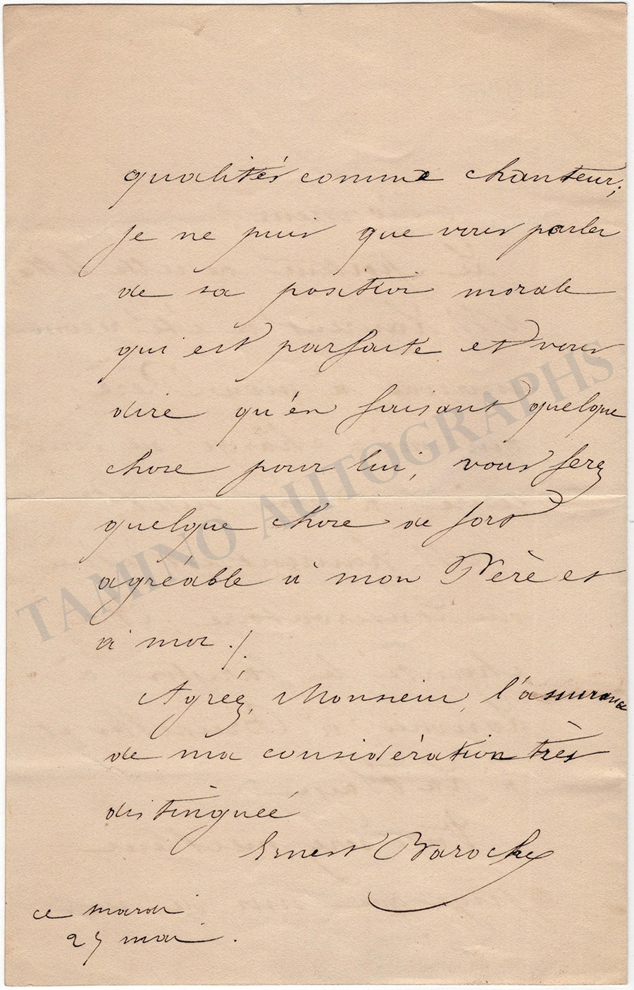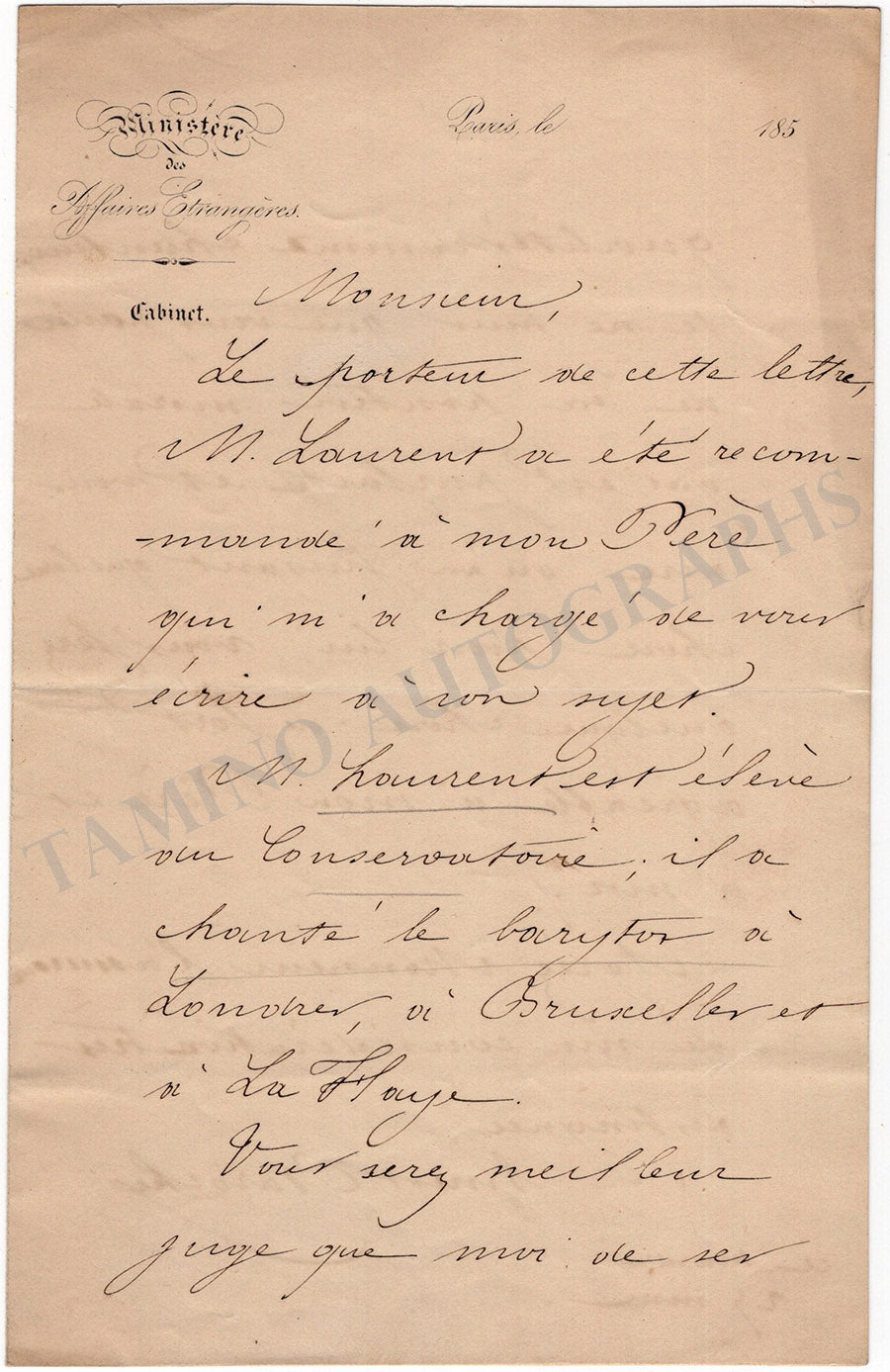 A. Ce Mardi 27 Mai [1850 ca.]. To a gentleman, recommending a young singer: “…M. Laurent est élève au Conservatoire; il a cahnté le baryton à Londres, à Bruxelles et à La Haye…”. 2 pp. In-8. With letterhead.